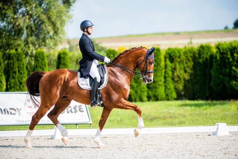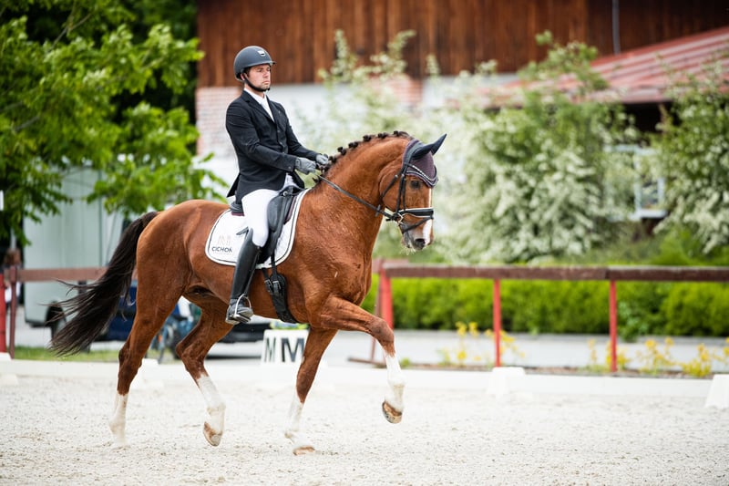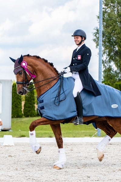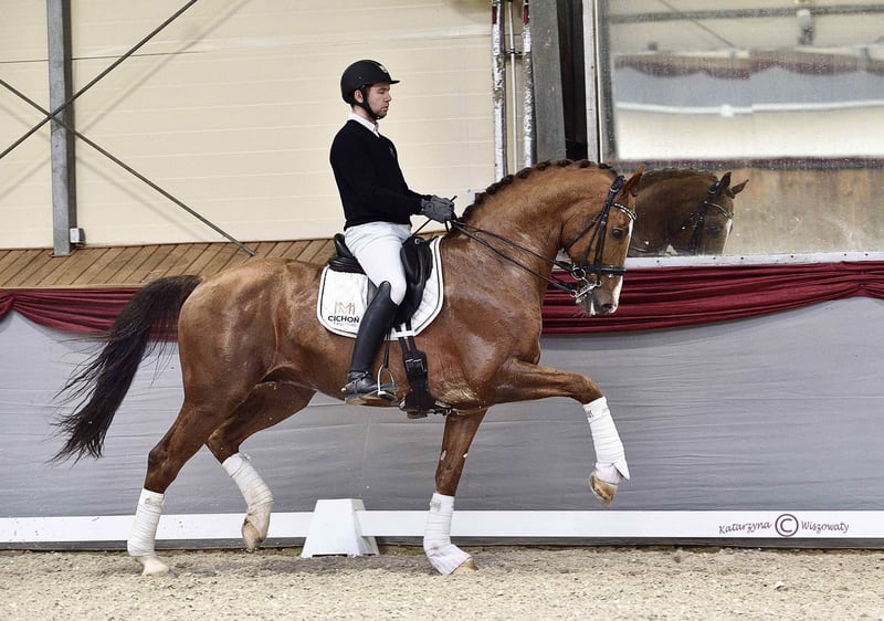 Ce magnifique étalon de dressage, non seulement un excellent reproducteur, mais également un sportif titré, est en même temps un bon partenaire pour accéder à un niveau supérieur dans le sport pour les cavaliers moins expérimentés ! Il a commencé sa carrière sportive en tant que médaillé de bronze aux Championnats du Danemark des Jeunes Chevaux et a obtenu la deuxième place au test des étalons DWB. Il a concouru avec succès jusqu'au niveau de la classe C, remportant notamment le titre de Champion de Silésie Senior 2023 et gagnant la Coupe d'Hiver de Pologne du Sud 2023. En parallèle, il exécute des éléments de niveaux supérieurs, y compris des éléments de niveau GP. Parmi sa descendance, on distingue Heiline’s Oh Land, qui concourt aux États-Unis avec des résultats de plus de 70 % au niveau des petites épreuves (par père Diamond Hit), ainsi que l'étalon Game On, élevé au Danemark (par père Locato), qui a terminé deuxième lors des Championnats du Monde des Jeunes Chevaux en 2019 dans la demi-finale pour chevaux de 4 ans. Parmi les descendants élevés en Pologne, on peut citer l'étalon Goldfinger, avec le poulain Carewicz (par père Corrado Son), vendu pour la somme de 10 200 euros lors de la Cichoń Foals Auction 2020, ou encore la gagnante du Championnat Ouvert des Poulains de Races Nobles 2022 dans la catégorie des poulains de dressage - la jument Savadora Gold EQ (par père Franklin), qui a ensuite été vendue à la Cichoń Foals Auction pour un montant de 11 100 euros. Goldfinger provient des meilleures lignées néerlandaises de dressage. Son père – Jazz – a occupé pendant des années la première place du classement mondial WBFSH, transmettant d'exceptionnelles prédispositions en dressage et laissant derrière lui des chevaux aussi remarquables que Johnson – actuel leader du classement WBFSH – ou Jerich Parzival, qui a remporté la médaille d'argent aux Jeux Olympiques de 2012 avec Adelinde Cornelissen. Sa mère – Velvet V.D.T. – fille du médaillé olympique Olympic Ferro, est l'une des meilleures juments reproductrices du livre KWPN, mère de 4 étalons reconnus et du cheval Bestseller VDT, qui concourt au niveau Grand Prix.