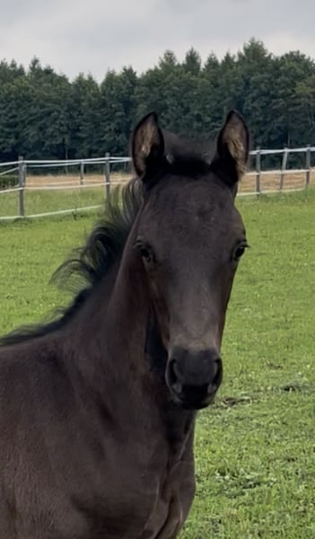 Zum Verkauf steht das vielversprechende Rapp-Hengstfohlen „VALENTINO VR 46“ mit interessanter Abstammung und hervorragender Perspektive für den gehobenen Freizeit- und Dressursport. Name: Valentino VR 46 * 12.06.2025 🖤 Rappe Abstammung: D‘Agostini S x Don Juan De Hus Valentino überzeugt durch sein zugängliches, selbstbewusstes und menschenbezogenes Wesen. Er zeigt sich altersgemäß neugierig, freundlich und im Umgang sehr angenehm. Er präsentiert sich sehr bewegungsstark, ist langbeinig, mit einer äußerst aktiven und kraftvollen Hinterhand, guter Balance und viel natürlicher Elastizität. Damit bringt er tolle Voraussetzungen für die spätere Ausbildung im Dressursport mit, eignet sich aber ebenso hervorragend für ambitionierte Freizeitreiter. Ein typvoller junger Rappe mit Charme, Qualität und Entwicklungspotenzial.