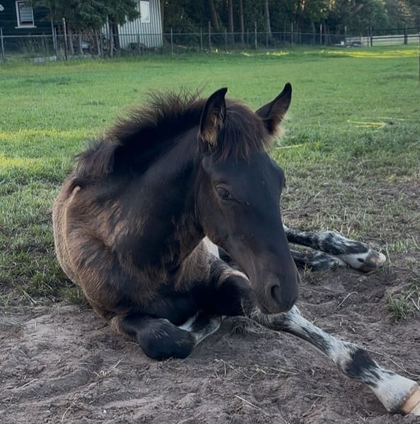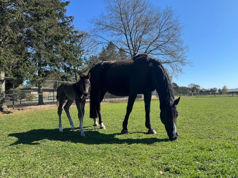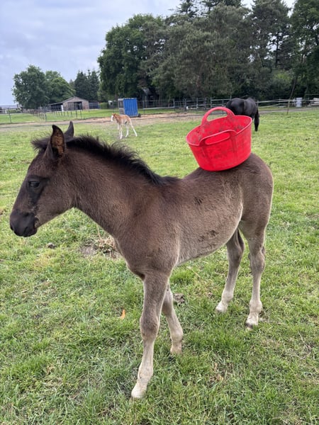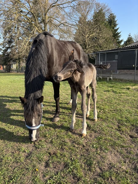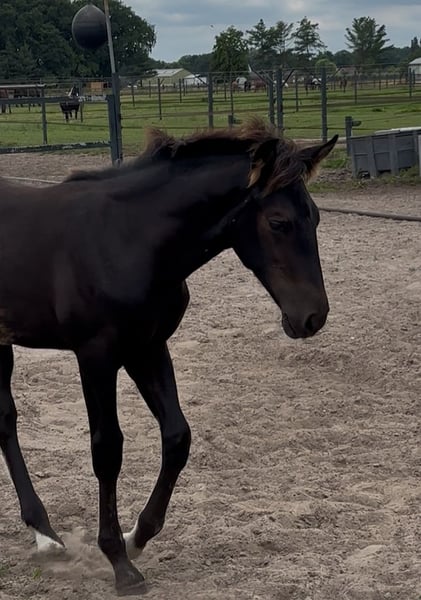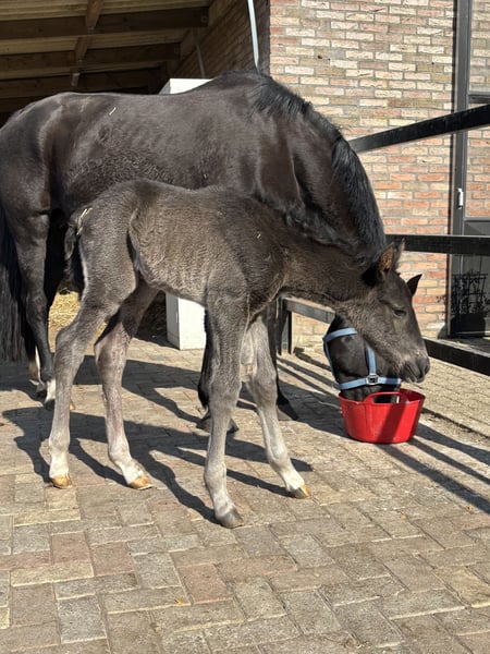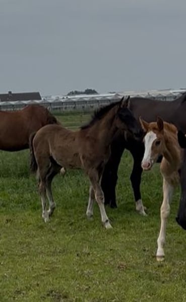 ⚜️Victorius de Elegante CH ⚜️ Deze jonge hengst verenigt dressuurpotentieel, veelzijdigheidstalent en een uitstekende afstamming. Helder van geest, sterk in beweging - een echte hoop voor de toekomst in de sport. Hij is absoluut cool en aanhankelijk, en zal een geweldige en top betrouwbare partner worden voor sport of vrije tijd. Zijn vader 🇪🇸 geeft zijn eigenschappen doorslaggevend door, naast een topkarakter, zeer goede rijdbaarheid en zenuwkracht, natuurlijk ook zeer goede gangen met de natuurlijke aanleg voor verzameling. Zijn moeder 🇩🇪 zelf is veelzijdig gefokt met springcapaciteiten en heeft zelf eventing gelopen met o.a. Boekelo. Een veulen dat door zijn uitstraling en typevorming weet te bekoren en gezegend is met drie goede basisgangen en met een zeer vriendelijk karakter en altijd vriendelijk naar de mens toe. Onze veulens staan, als het weer het toe laat, vanaf de geboorte 24/7 buiten, uit vele onderzoeken blijkt dat dit de BASIS is voor een super sterk paard. Hierdoor krijgen ze later minder snel blessures en worden hun pezen en botten extra sterk gemaakt. Ook staan ze als famillie samen merries hengst veulens, dit zorgt ervoor dat ze zich extra ontwikkelen op sociaal gebied. Wat ook veel veulens missen in hun eerste maanden. Ook later in de opfok staan ze in een gemengde kudde van alle leeftijden, dit zorgt voor een goede opvoeding door een goede hiërarchie. Hun krijgen hierdoor een hele sterke basis en de beste start die je maar kunt wensen voor elk veulen. Hier zullen ze later altijd de vruchten van blijven plukken en ook als eigenaar is dit super fijn om een paard te hebben met zo’n sterke en gezonde basis. Wij laten onze veulens vrij snel naar de geboorte aan alles wennen. Tractor, bladblazer, paraplu, bosmaaier noem maar op ….. alles wat wij dagelijks gebruiken en herrie maakt! En met een relaxte mama aan hun zijde vinden ze dit alles normaal. Voetjes geven, vast staan, borstelen, aanraken op heel het lichaam worden ze mee groot! Hoefsmid, chippen/inenten en wormenkuur geven- geen enkel probleem. Onze veulens staan, als het weer het toe laat, vanaf de geboorte 24/7 buiten, uit vele onderzoeken blijkt dat dit de BASIS is voor een super sterk paard. Hierdoor krijgen ze later minder snel blessures en worden hun pezen en botten extra sterk gemaakt.
