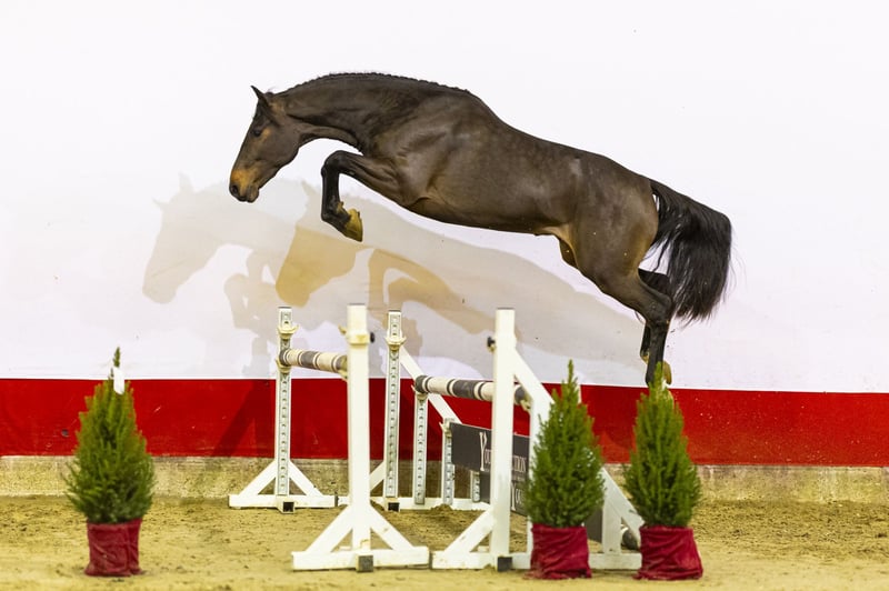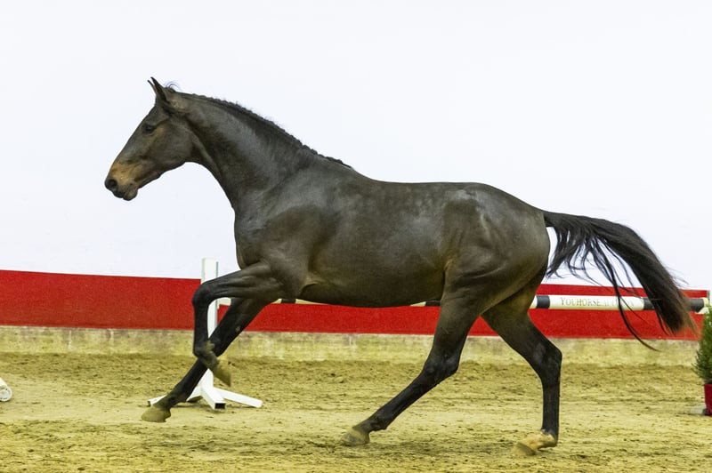 Trevor VBT is a two-year-old stallion with a notably kind and cooperative character. He has already been lightly handled and lunged, making him easy to work with. In motion he shows a balanced, ground-covering canter and a nice jumping technique. His way of moving and jumping gives him a modern sport type and also makes him interesting for the hunter ring. Trevor VBT is bred from Di Cassini SB x Ginus. Sire Di Cassini SB, a son of Diamant de Semilly, brings scope, mentality and international jumping quality. Diamant de Semilly himself competed at 1.60m level and is one of the most influential sires in modern showjumping. The dam BrittLena (by Ginus) comes from a highly proven performance family. The granddam Solena D.M.L.competed at 1.20m level and produced several sport horses, including Vancouver D.M.L., an approved stallion who competed at 1.60m level. Further in the damline we find Mondial III, who competed at 1.50m level, as well as multiple horses performing internationally at 1.40m level and above. This damline is known for consistency, rideability and long-term sport performance, with both international jumpers and approved stallions. Trevor VBT combines an easy character and quality canter with a pedigree that has proven itself at the highest levels of the sport.