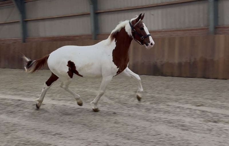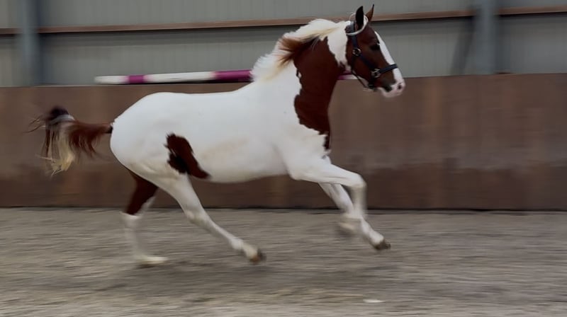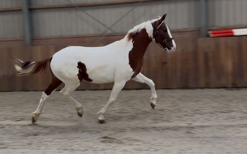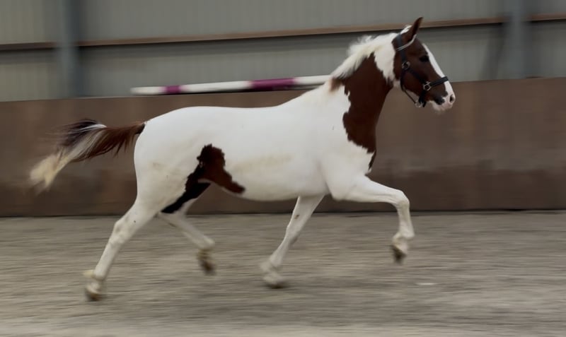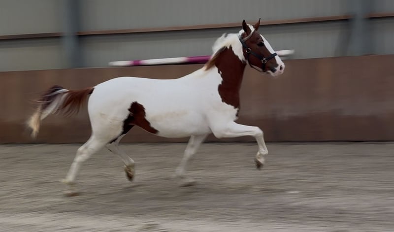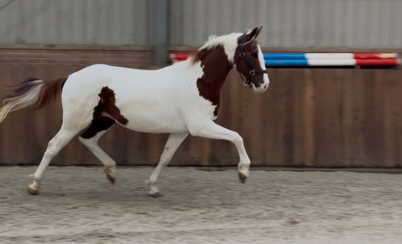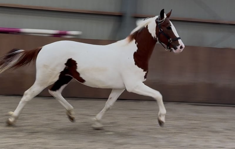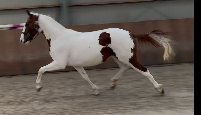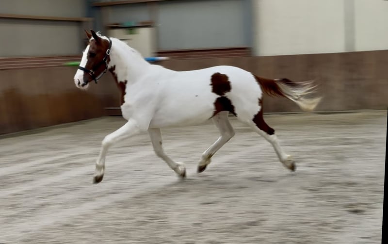 Gerne stellen wir Ihnen Sepp van de Lisdodde vor. Sepp ist ein auffallend schöner Hengst, nicht nur wegen seiner beeindruckenden Scheckung in Plattenfarbe, sondern auch aufgrund seines modernen Typs und Erscheinungsbildes. Sein Vater ist der bunte Hengst Indi, seine Mutter stammt von der bekannten Top-Dressurvererberin Negro ab. Dies zeigt sich auch in seinen Bewegungen: Sepp zeigt eine besonders schöne Haltung im Trab und Galopp. Er bewegt sich mit starkem Hinterbein und bergauf, zeigt viel Raumgriff und eine gute Beintechnik. Sepp ist noch nicht trainiert und unbeleert, jedoch ist er ehrlich und umgänglich im Umgang. Bei Interesse bitten wir um Anruf oder WhatsApp, Telefonnummer: +31643197337. Ein Video kann auf Wunsch per WhatsApp angefragt werden.