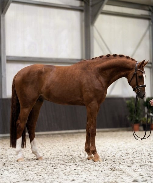 Hervorragender dreijähriger Fuchshengst zum Verkauf, der eine einzigartige Gelegenheit für den professionellen Sport und die Zucht bietet. Dieser junge Nachwuchshengst vereint weltklasse Genetik mit einem modernen, athletischen Körperbau. • Pedigree: Arezzo VDL (Chin Chin x Heartbreaker) x Quidam de Revel (Jalisco B) • Größe: ca. 173–174 cm (17.0 – 17.1 hh) • Gesundheit: Vollständig gesund mit aktuellen, sauberen Röntgenbildern (inklusive Beine, Hals und Rücken) • Fähigkeiten: Derzeit ungeritten (roh). Er zeigt eine außergewöhnliche Technik im Freispringen mit enormer Sprungkraft und Power. Seine Bewegung ist modern, leichtfüßig und ausgeglichen • Conformation & Charakter: Korrekte Konformation, eindrucksvolle Erscheinung und ein sehr freundliches, umgängliches Temperament Eine perfekte Wahl für professionelle Reiter, Deckstationen oder als hochwertige Investition in die Zukunft