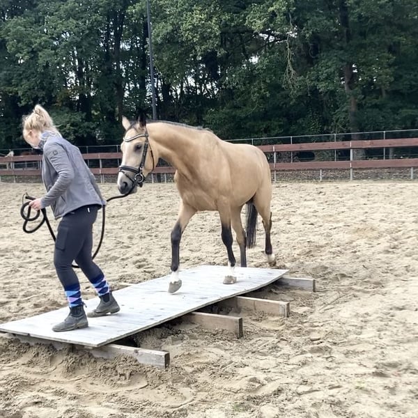 FEI PROSPECT / APPROVED STALLION! ⭐️ Heros is a 3,5 year old D-pony approved stallion / stud for breeding (and also sport), who measures 1.48m. With his beautiful buckskin color, he's a real eye-catcher! He has Zangersheide papers and his pedigree is: Hamlet x No Limit x Joost. His sire is the cremello stallion Hamlet, who is approved by the AES studbook. His dam's sire is the KWPN stallion No Limit, who jumped international at 1.60m level. No Limit has a jumping index of 150 with high reliability, placing him among the top performers. He is also known for his excellent offspring. No Limit is a offspring of the Preferent stallion Indoctro, who became the performance champion as a 3 years old. He also won the IAN Trophy in the 4 years old competition. At the age of 6, he competed in the World Championships for Young Show Jumpers in Lanaken, where he finished 6th. At 8 years old, he was already jumping at the 1.40/1.50m level, winning the Audi Cup and the stallion show jumping competition in Dortmund. Heros's dam line also includes the Holsteiner Preferent stallion Joost, who jumped at 1.50m. As you can see, Heros has a very beautiful and successful bloodline. https://www.horsetelex.nl/horses/pedigree/2630307/heros-by-esclinic-z Heros has incredibly good gaits! In the photos and video, we showed him jumping free for the very first time when he was only 2,5 years old (a year ago), jumping up to 1.20m straight away. He showed a very nice jump with a good back leg technique. We also saw that he really enjoyed jumping! Although he's an incredibly good jumper, we also expect that he will do good in dressage! He's a young, allround pony with plenty of potential. We have high expectations for him! Even though Heros is still young and a stallion, he's incredibly well-behaved and easy to handle! You wouldn't know he's still a stallion at all. He can also stay outside and on the stable next to the mares. He's very sociable with other horses. He knows how to groom/brush, lift legs, use a blanket, use a halter and of course, walk on a lead. We've also done some spook training with him. He'll easily walk past an umbrella, over a tarp, or even a wooden plank! We've now slowly started with making him saddle broken. He knows how to lunge with a bridle and saddle. He has been now under the saddle only a few times. He has also been on a strange arrea and has done his first jump under the saddle. He's doing it all good, but of course, he still has a lot to learn. He knew the trailer and little truck and is quietly on the road. He has no (stable) vices! He has clean X-RAYS for his neck, back, and legs without any remarks! He’s recently approved as an approved stallion by the EU-recognized RBP studbook. We already expect two foals from him next year and the mares where pregnant at the first time trying. A great opportunity for someone looking for a high quality, allround children's and sport/jumping pony or approved stallion for breeding. He's also interested for the international FEI competitions in the future. Of course, it's up to the new owners whether they leave him as a stallion or castrate him. € 11.500