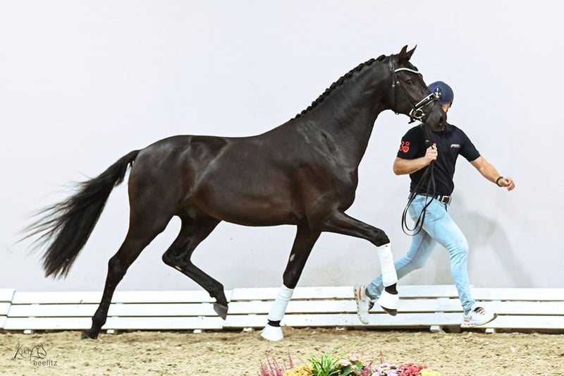 Der So Perfect-Sohn Sir Franklin wurde bei der Oldenburger Hauptkörung 2025 gekört und beeindruckt mit seinem modernen, typvollen Erscheinungsbild, seiner elastischen Bewegungsdynamik sowie erstklassigen Grundgangarten. Besonders sein schwungvoller Trab, der bergauf angelegte Galopp und ein taktsicherer, energischer Schritt begeisterten sowohl Zuchtexperten als auch das Publikum. Auch Hendrik Sosath zeigt sich begeistert von diesem Neuzugang: „In diesem Hengst vereinen sich drei der derzeit wohl gefragtesten Vererber: Sezuan, Ampère und Gribaldi.“ Abstammung Die Abstammung von Sir Franklin zeichnet sich durch eine außergewöhnliche Dichte an sportlichen Erfolgen sowie international anerkannten Vererbern im Dressursport aus und bietet damit ein verlässliches Leistungspotenzial. Auf väterlicher Seite überzeugt So Perfect unter Leonie Richter sowohl züchterisch als auch sportlich. Bereits als Reservesieger der Oldenburger Hengst-Tage 2019 stellte er seine hohe Zuchtwertigkeit unter Beweis. Parallel dazu behauptet er sich erfolgreich im Spitzensport und ist inzwischen bis zur anspruchsvollen Klasse Intermediaire II platziert. Diese Verbindung von Körqualität und eigener sportlicher Leistung unterstreicht seine besondere Vererberstärke. Die mütterliche Linie entspringt einem bewährten, international erfolgreichen niederländischen Stamm. Die Mutter Lufradin war selbst in den Niederlanden bis zur M-Dressur erfolgreich und steht damit für Rittigkeit, Leistungsbereitschaft und sportliche Veranlagung. Bereits die zweite Mutter Unette II machte züchterisch auf sich aufmerksam. Sie brachte den gekörten und hoch erfolgreichen Estoril v. Zhivago hervor, der unter Emmelie Scholtens (NED) mehrfach Finalist bei den Weltmeisterschaften der jungen Dressurpferde war (fünf- und sechsjährig). Darüber hinaus lieferte Unette II mit Junette RS2 v. De Niro ein weiteres bis M-Dressur erfolgreiches Sportpferd. Die sportliche Kontinuität setzt sich in der dritten Mutter Unette bemerkenswert fort. Zu ihren S-erfolgreichen Nachkommen zählen der im Grand Prix platzierte F. Charly v. Akteur, das in den USA bis Intermediaire I erfolgreiche Pferd Pulidon v. Burggraaf sowie die in der S-Dressur erfolgreichen Ramzes v. Cocktail und Klavier v. Balzflug (unter Udo Lange). Ergänzt wird diese Linie durch den gekörten Hengst Mondriaan v. Balzflug, der selbst in der M**-Dressur** überzeugte. Die züchterische Fundierung findet ihre Bestätigung in der vierten Mutter Nannet, die gleich drei international erfolgreiche S-Dressurpferde stellte: Calador v. Amor (unter Bent Jensen, USA) und Byoux v. Le Mexico (unter Anne Franssen, NED) waren im Grand Prix erfolgreich, während Candy v. Le Mexico unter Jochen Hippenstiel im Prix St. Georges überzeugte. Abgerundet wird das Bild durch die herausragende Leistungsdichte des gesamten Mutterstamms, aus dem zudem international erfolgreiche Grand-Prix-Pferde wie Kingston v. Voltaire (Leslie Morse, USA) und Vradin v. Gribaldi (Simon Missiaen, BEL) hervorgegangen sind.