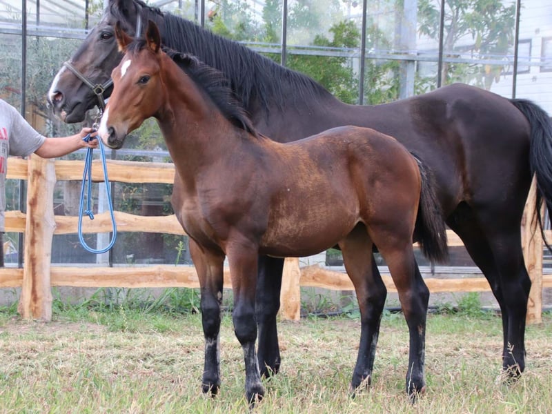 Born on 03.04.2025 Large, well-built, correct colt with good movements and a lot of power in the hindquarters. The foal has a very sweet and affectionate character. Sire: Emiliano (Escamillo x Vitalis x Likoto xx) is a young German stallion who won his 50-day stallion test in Adelheidsdorf. He seems to be a good father – several foals from his first crop in 2024 were selected/sold at German foal auctions. Comment on Horses.nl about Emiliano: “Emiliano (Escamillo x Vitalis) completed the 50-day test in Adelheidsdorf as the best dressage stallion. The three-year-old stallion, winner of the Westfalenwappen earlier this year, received an average of 8.45 for the dressage components. A horse with a very good future ahead of him,” was the first reaction of the evaluation committee regarding Emiliano. The assessment included walk, interior, character, and willingness to work with nines.” Dam: Royalistin (Royal Diamond x Sao Paulo x Feingau) is a Hanoverian Verband premium mare. She comes from the same mother as the dressage sire Rosentanz (by Rohdiamant). Rosentanz was licensed in Hanover in 2003 and sold for 200,000 euros to Denmark, where he was used as a breeding stallion. His performances reached GP level. Royalistin has already produced several good sport horses, including Prinzessin (Grand Prix) – Fürstenkind (Prix Saint Georges) – For Diamond (auction horse at the Oldenburg saddle inspection) – Queran (finalist 4-year-old Belgian Cup Dressage) – Sacramento (successful young dressage horses UK) – Pomme d'Amour (good EPTM test).