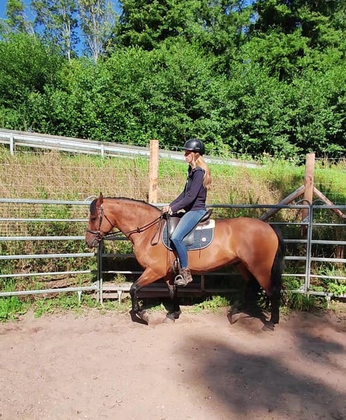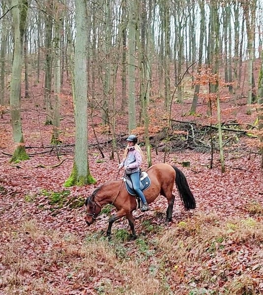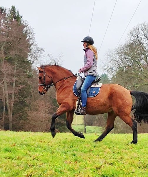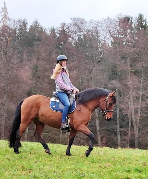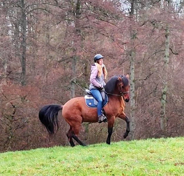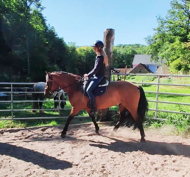 **FOR SALE ON BEHALF OF OWNER** Leonhard's Nike – Versatile and beautiful riding horse for ambitious riders! A 10-year-old, 15.5 hh gelding (PRE x Welsh-D/Haflinger) with full pedigree: Sire: Naviero (Pura Raza Española), Dam: Vanessa (Welsh D / Haflinger), in the striking rare color of bay falcon with a magnificent tail and mane! He was awarded as a premium foal. NIKE immediately impresses with his strong presence and upright posture. Well-mannered and attentive in handling, he delights under saddle with his natural collection and smooth, expressive movement. He is solidly trained in dressage up to level L and rides confidently in the arena and indoor riding hall. The large dressage arena awaits him, and he also shows great talent and enthusiasm in working equitation. A fantastic horse for fun, training, and progression. To work focused and obediently, NIKE benefits from the presence of other horses. He is also accustomed to riding alone, but tends to become uneasy outside his comfort zone, so he is usually ridden in a group. Currently, he is in professional trail riding training and is expanding his skills in this area. NIKE has also been introduced to jumping and demonstrates courage and ambition. He has proven to be a well-behaved school horse and enjoys being ridden in the arena. He has experience in show jumping competitions and in lead-rein classes. He can also perform some circus tricks, such as the Spanish salute. This is an exceptionally versatile and stunning horse for sale! Perfect for re-entrants, ambitious dressage and show jumping riders, or experienced leisure riders. *** VIDEOS and additional pictures/info available via WhatsApp at 0177 8787640 *** NIKE’s three excellent basic gaits are very comfortable to sit, and he can canter very slowly and smoothly. His connection to the bit is fine, making riding and executing learned movements enjoyable. Due to his Spanish temperament, a confident rider who is secure in the saddle and not afraid is recommended. **www.handmade-horses.de** - Trained up to level L (Dressage) - Safe in group trail riding - Suitable for re-entrants / advanced riders - Weight carrier - Healthy - Vaccinated (Tetanus & Influenza) and dewormed - Full papers and equine passport - Farrier- and loading-trustworthy - Includes complete equipment (jump saddle, bridle, blankets, etc.) A pre-purchase examination can be arranged upon request. Getting to know each other & trial riding (50 euros per session), transport to the new home, etc., can be organized after prior arrangement and at the buyer’s expense! NIKE is well-socialized (dominant in the herd), farrier- and loading-trustworthy, currently barefoot, vaccinated against tetanus and influenza, familiar with box stalls, open stalls, and pasture turnout. Excellent health, no illnesses or injuries. The owner is selling this wonderful horse for private reasons and is seeking a caring, supportive home. Please contact me via WhatsApp at 0177 8787640 if genuinely interested.