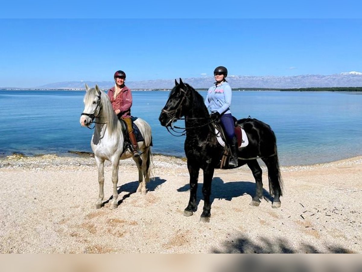 Unser Jadran ist ein 7 jähriger Wallach der Sonderklasse. Wir verkaufen ihn, weil sich herausgestellt hat dass wir in unserer Reitschule fast nur Kinder und Jugendliche haben und Jadran einfach nicht ausgelastet wird. Deshalb geben wir ihn gerne in gute Hände weiter. Jeder findet Jadran schön mit seiner glänzenden schwarzen Jacke. Er ist ein Mix aus Lipizaner und kräftigem kroatischem Warmblut. Ein echter Gewichtsträger der auch größere Reiter gut aussehen lässt. Sein Papier führt ihn als kroatisches Warmblut. Er ist ein - und zweispännig gefahren. Wenn Interesse besteht können wir ausreichend Videos zuschicken. Vor der Kutsche geht er auch im Galopp ohne Probleme und lässt sich gut wieder zügeln. Seine schöne Halsung läßt ihn leicht am Zügel stehen. Auch beim Reiten ist seine Galoppade schön bergauf und jederzeit kontrollierbar. Jadran liebt Routine und lernt schnell. Er schenkt sein Vertrauen neuen Menschen nicht gleich beim ersten Mal, aber kleinen Karottenstückchen kann er nicht widerstehen. Im Gelände geht er sowohl vor und auch hinter. Am liebsten in einer kleinen Gruppe. Jadran steht in Kroatien direkt am Meer. Im Sommer gehen wir mit ihm schwimmen. Unsere kleine Reitanlage mit 4 Pferden ist mitten in einem 5 Sterne Resort. ( Falkensteiner Punta Skala). Wenn Sie an Jadran interessiert sind könnten Sie einen Kurzurlaub im Hotel buchen und Jadran kennen lernen.