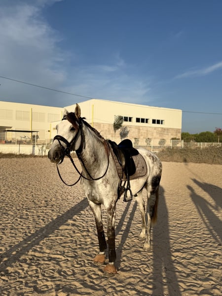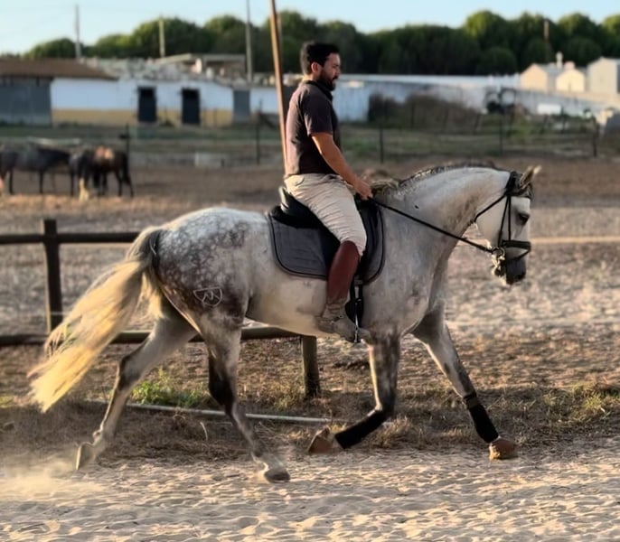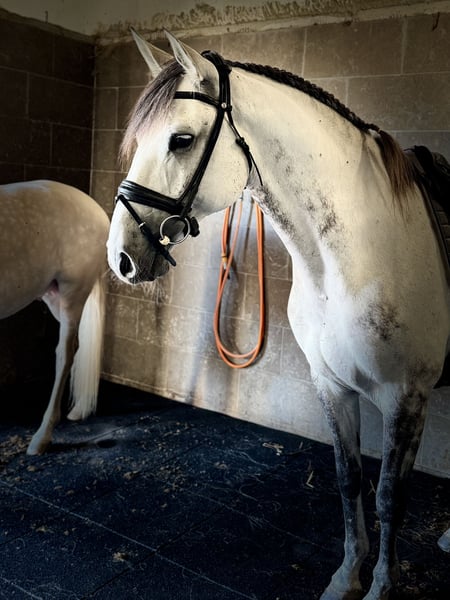 Lusitano Gelding LIRICO – talented gray with expression Features: - Breed: Lusitano - Gender: Gelding - Year of Birth: 2015 - Color: Gray - Height: 165 cm LIRICO is a charismatic Lusitano gelding in the typical gray color with a height of 1.65 m. He impresses with a lot of go and presence, while always remaining clear-headed and reliable. LIRICO has already gained competition experience in Portugal and masters flying changes, piaffe, and passage. His very good basic gaits further emphasize his athletic quality. In daily handling, he is always friendly, uncomplicated, and relaxed. He is motivated, responsive to aids, and absolutely safe – however, we wish for him to have an experienced rider who can properly appreciate his energy and talent. He is also uncomplicated when loading and travels calmly. Another quality feature is his excellent pedigree: All of his ancestors have been rated with over 70 points, which speaks for the disposition and potential of this horse, even though he will not be used for breeding as a gelding. LIRICO is an exceptional partner for ambitious riders who enjoy a performance-oriented and expressive Lusitano and want to continue their sporting journey together with him. We have X-rays of the legs and back, which are flawless. I can gladly provide more pictures and videos if interested.