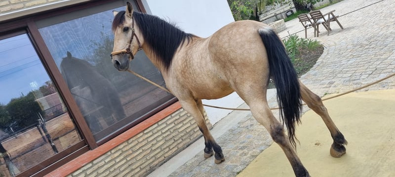 Apolo ist ein sehr aufgewecktes kleines und kompaktes Pferd mit wunderschöner Fellfarbe, sehr wachsam, clever aber manchmal ein Sturkopf. Wenn er zu dir Vertrauen gefasst hat, ist er verschmust, lernwillig und anhänglich. Er ist barhuf unterwegs was ihm keine Probleme bereitet. Er ist exzemfrei und überhaupt ein sehr robuster Bube. Mit ihm wurde hauptsächlich am Boden gearbeitet. Er ist auch eingeritten, reagiert ganz fein auf Hilfen und ist ein Pferd mit ausgeprägtem Vorwärtsdrang. Apolo ist absolut kein Anfängerpferd, braucht eine einfühlsame, klare konsequnze Führung und ausgewogene, regelmässige Beschäftigung. In der Herde zeigt er sich oft verunsichert und eher rangniedrig. Apolo lebt auf einer Finca im Jerez de la Frontera, die von meiner Schweizer Freundin geführt wird. Mein Bube wird nur an einen sehr guten Platz verkauft. Bei Fragen, erreicht Ihr mich unter der Nummer ±41 79 416 79 13 Silvia Kaufmann
