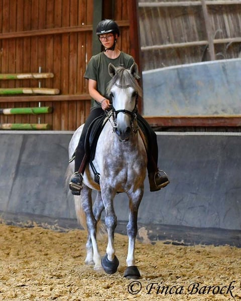 Breed: PSL Name: Quartzo LF Gender: Gelding Height: 16.2 hh Date of Birth: May 29, 2020 Color: Grey (Dun) Price: €14,900 Sire: Atrevido v. Iraque Dam: Doninha II v. Rubi Quartzo is a typy Lusitano with a friendly character and comfortable, balanced movements. He is extremely affectionate and people-oriented. In addition to his good conformation and temperament, he impresses with his rideability and willingness to learn. His uphill canter is particularly remarkable; riding him feels like floating on clouds <3. When faced with unfamiliar situations, Quartzo tends to pause but is easily persuaded to pass by new objects or obstacles. He loves water and enjoys splashing in puddles — a real highlight for him! Currently, Quartzo is in training for walk-trot transitions under saddle. Lateral work such as shoulder-in and travers on the ground already go very well, and he has begun working on travers. From the ground, we are also working on Spanish walk, and he already shows very nice, elevated steps. Overall, we experience Quartzo as a very confident, attentive horse that enjoys new challenges. And that canter... <3 He loves free jumping and hacking out. Overall, he is very versatile — whether work on the lunge, double longe, trail riding as a lead horse, or riding with a partner. Quartzo is sensitive and needs a clear, consistent rider. He is not suitable for beginner riders. He always wants to please and is extremely eager to do everything correctly. If you ask the same lesson three times in the same spot, he quickly anticipates it. A true delight for the refined rider who desires a responsive, clear-headed horse. Quartzo is used to herd life and gets along well with a variety of other horses. Includes veterinary examination and X-rays. Contact: Finca Barock, Tel. 0173-696 31 81, 56291 Wiebelsheim