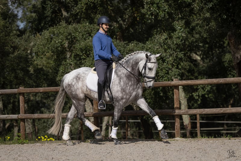 Qing RS (08/2020) 1,64 m piro-frei RX für den Sport zugelassen Qing ist ein talentierter, leichtfüßiger Lusitano-Wallach (PSL), Sohn des Grand Prix-Hengstes Jasmim Plus und mütterlicherseits verbunden mit Quadrado MAC (Coimbra). Er verfügt über drei überdurchschnittliche Gangarten: einen außergewöhnlich guten Schritt, einen leichten, schwebenden Trab mit schöner Schulterfreiheit und starkem Hinterbein sowie eine sehr ausgeglichene Galoppade. Aufgewachsen in Belgien. Gepflegt und gut erzogen. Ein sehr anhängliches und liebenswertes Pferd. Die letzten sechs Monate befindet er sich in professionellem Training in Portugal, wo er für den Verkauf vorbereitet wird. Ausbildungsstand: Seitwärtsarbeit, Kontragalopp, erste fliegende Wechsel. Er ist auch mit Bodenarbeit (TRT-Methode), Longieren und Handarbeit vertraut. Er kommt gut mit anderen Pferden aus. Im Umgang ist er sehr brav und gut erzogen. Qing gehört in eine höhere Preisklasse (>25.000 €) und ist in Portugal zu besichtigen.