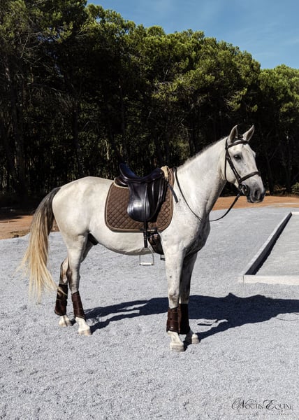 Orion VA is a charismatic 7 year old APSL Lusitano gelding. Wherever he goes, he’ll impress the people around him, with his expressive appearance, his golden glow, long dark mane and tail. He is a baroque type with a beautiful compact conformation. He is very well behaved, confident and calm, he has character, but he is super honest and fair. He loves to work with you, he loves the attention and he is full of energy. He has three very correct and balanced gaits, a wide walk, a comfortable trot and a super balanced uphill canter. Working with him is a true pleasure, he is very sensitive and responsive to the aids of the seat and legs, super light in the hands, just the weight of the reins in your hand. . He is ridden on a double broken water snaffle and goes barefoot everywhere without any problems. He is the ideal partner for a fine amateur rider. He does all lateral work, shoulder in and out, walk-canter transitions, counter canter, starting flying changes, starting exercises focused on higher school collection. If you are looking for a versatile partner, with talent for classical dressage and working equitation, he is the horse for you. About VA Lusitanos: We breed our horses with care, the foals are born in the field, grow up in the herd, on hilly terrain, with trees, bushes, open parts, rivers, and a little lake, so they get used and confident with all different types of surroundings. They always have good quality hay and their portion of grains and minerals available. They learn a lot of good social behavior from each other, their moms and aunties in the herd, besides social interaction with horses, daily interaction with humans is also an important part of their education. As we have very frequent interaction with our horses, they develop a deep trust in humans, which facilitates all of their interactions with both humans and horses. All of our customers confirm over and over again that our Lusitanos excel in confidence, calmness and ease of handling in all situations. Since we believe that the Lusitano horse needs time to mature and develop their bones and muscular structure, we start evaluating each individual VA Lusitano when they are 4 years old. Orion started his training when he was 4,5 years old, first on the lunge and in hand and since he is 5 years old also under the saddle. We have different VA Lusitanos available in different age groups. Green horses, trained in hand, under the saddle. You can find a full overview of our lusitanos on our website. We also have high quality guest houses available for our customers. When you buy a horse from us, your stay in one of our luxury guest houses is for free (max 5 nights) https://www.quintavaledeagua.com