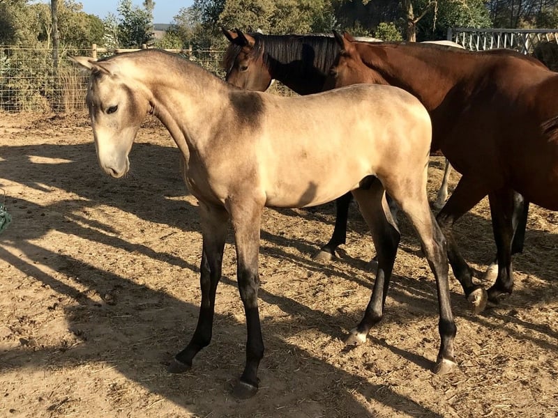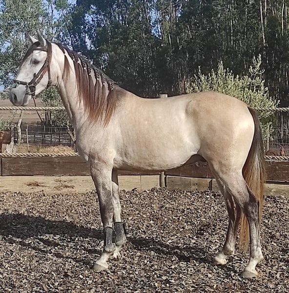 Orion VA is a charismatic 7 year old APSL Lusitano gelding. Wherever he goes, he’ll impress the people around him, with his expressive appearance, his golden glow, long dark mane and tail. He is a baroque type with a beautiful compact conformation. He is very well behaved, confident and calm, he has character, but he is super honest and fair. He loves to work with you, he loves the attention and he is full of energy. He has three very correct and balanced gaits, a wide walk, a comfortable trot and a super balanced uphill canter. Working with him is a true pleasure, he is very responsive and sensitive to the aids of the seat and legs, super light in the hands, just the weight of the reins in your hand. He is ridden on a double broken water snaffle and goes barefoot everywhere without any problems. He is the ideal partner for a fine amateur rider. He does all lateral work, shoulder in and out, walk-canter transitions, counter canter, starting flying changes, starting exercises focused on higher school collection. If you are looking for a versatile partner, with talent for classical dressage and working equitation, he is the horse for you. About VA Lusitanos: We breed our horses with care, the foals are born in the field, grow up in the herd, on hilly terrain, with trees, bushes, open parts, rivers, and a little lake, so they get used and confident with all different types of surroundings. They always have good quality hay and their portion of grains and minerals available. They learn a lot of good social behavior from each other, their moms and aunties in the herd, besides social interaction with horses, daily interaction with humans is also an important part of their education. As we have very frequent interaction with our horses, they develop a deep trust in humans, which facilitates all of their interactions with both humans and horses. All of our customers confirm over and over again that our Lusitanos excel in confidence, calmness and ease of handling in all situations. Since we believe that the Lusitano horse needs time to mature and develop their bones and muscular structure, we start evaluating each individual VA Lusitano when they are 4 years old. Orion started his training when he was 4,5 years old, first on the lunge and in hand and since he is 5 years old also under the saddle. We have different VA Lusitanos available in different age groups. Green horses, trained in hand, under the saddle. You can find a full overview of our lusitanos on our website. We also have high quality guest houses available for our customers. When you buy a horse from us, your stay in one of our luxury guest houses is for free (max 5 nights) https://www.quintavaledeagua.com