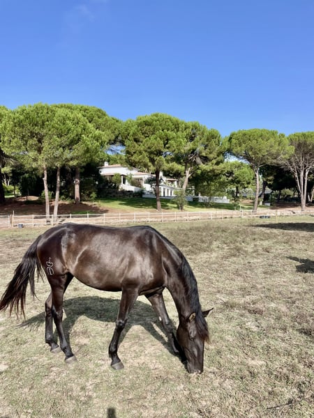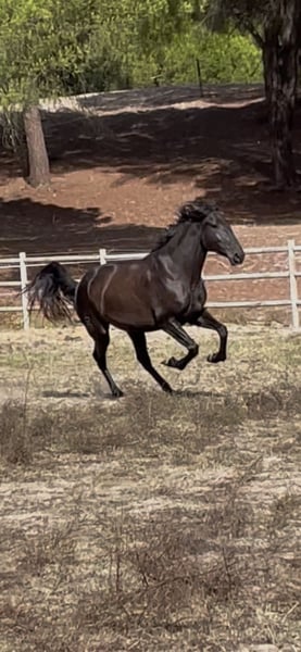 Sinfonia is a beautiful black mare who enjoyed her youth in a herd in freedom at our stud (www.coudelaria-linda-oliveira.com). Now, at three and a half years old, she is stabled and has been gently started under saddle. In summer, her coat shines chocolate brown, and in winter she is a black. She shows exemplary rideability and willingness to cooperate in her first steps under saddle. She possesses three good basic gaits, a harmonious conformation, and the proverbial "clear mind" of a Lusitano. She will bring much joy to her future owner and be a great partner. This is an opportunity to find and secure your dream horse at this early stage. She can stay with us for further training, and we also offer the rider the option to stay in our comfortable guesthouse and grow together with their horse through excellent lessons. She could also be of interest for breeding, as she has very good bloodlines from the Ortigao Costa breeding in her pedigree and can pass on the rare black color in Lusitanos. For more details and information, feel free to contact us via WhatsApp at +49 17644482124.