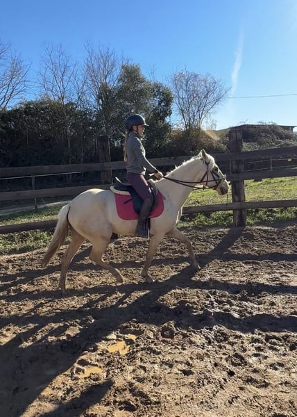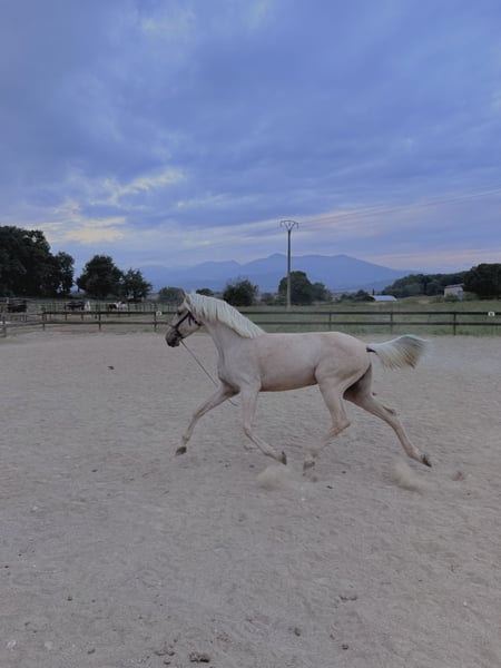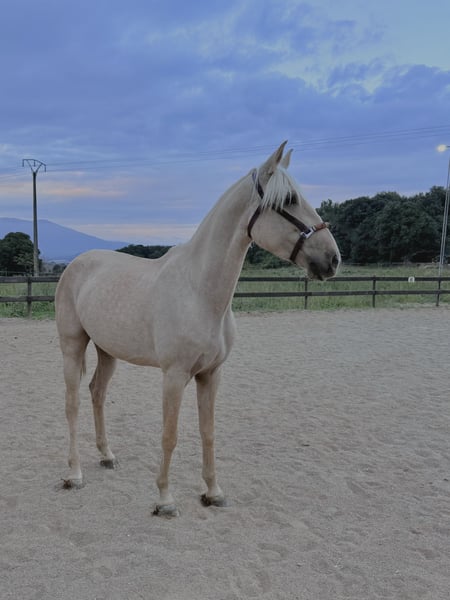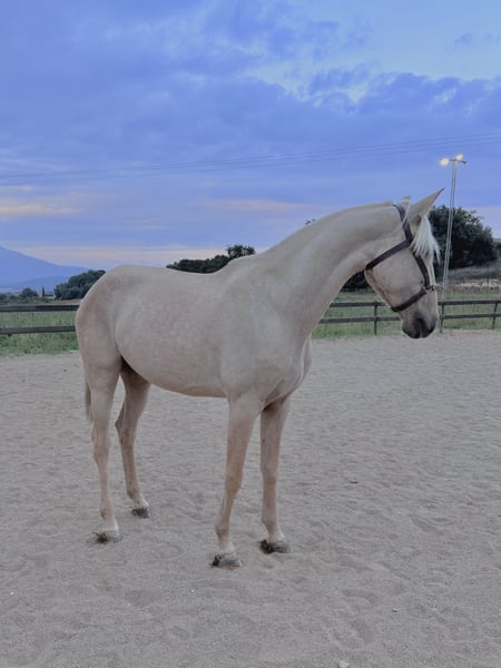 Exzellente isabelina Lusitana der Zuchtstätte SOL aus Spanien, mit hervorragenden Bewegungen, 4 Jahre alt und 1,62 m groß. Geritten in den drei Grundgangarten, mit Ziel und Potenzial für Turniere in der Dressur in vier Jahren. Sie zeigt ein sehr gutes Temperament beim Reiten und am Boden. Liebenswert, edel und mit einem sehr guten Kopf für ihr Alter.