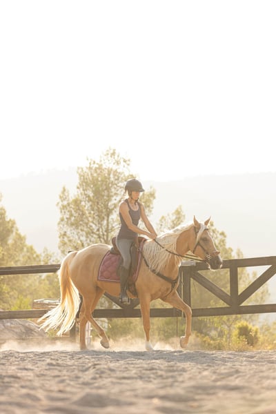 TRIANA – Cavalla Hispano-Araba x Lusitano – Palomino – 5 anni In vendita Triana, giovane cavalla di grande qualità, elegante, equilibrata e con una solida base di addestramento. Triana è Hispano-Araba x Lusitano, figlia di fattrice Lusitana e del rinomato Tapete YM (Scuderia Militare). Iscritta al registro ANCADES – Cavallo Sportivo Spagnolo. Nata: febbraio 2021 (5 anni) Altezza: 163 cm Mantello: Palomino Segni: stella in fronte e un calzino posteriore Addestramento iniziato aprile 2025, con metodo rispettoso e progressivo. Ottima base di lavoro in libertà e addestramento alla voce. Lavoro focalizzato su propriocezione, equilibrio e sviluppo muscolare armonico. Lavora ai tre andamenti, esce in passeggiata sola o in compagnia. Ha affrontato con successo il suo primo lungo viaggio a El Rocío, dimostrando grande affidabilità. Abituata a ogni tipo di stimolo ambientale. Montata bitless, conosce anche l’imboccatura. Cavalla dolce, collaborativa e molto affettuosa.