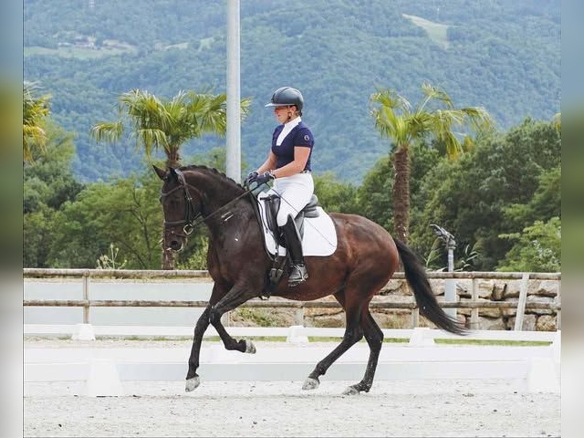 We are pleased to present an elegant 6-year-old Lusitano mare, dark bay, standing at 1.60 meters, already ready to excel in dressage competitions. Her sire: Rubi AR – An internationally renowned stallion known for his power, suppleness, and exceptional genetics, which he passes on to his offspring. Her dam’s sire: Sueste SS – A breeding stallion that brings elegance, balance, and quality movement, while maintaining a frank and cooperative character. With her harmonious build and a touch of sophistication, this mare displays three beautiful gaits, consistency, and balanced movement. She is quite easy to handle and very affectionate in daily life, adapting well to both pasture and stable/paddock life. Currently trained by a professional rider and also ridden by an amateur rider at level 3. She has already won in Amateur 3 (over 70%), is familiar with the movements required at Amateur 2 level, and proves to be reliable and willing. She is sound for changes of leads. Thanks to her young age, ease of handling, and serious work ethic, she offers an excellent opportunity for an experienced and guided rider seeking to develop confidently in dressage with a quality mare.