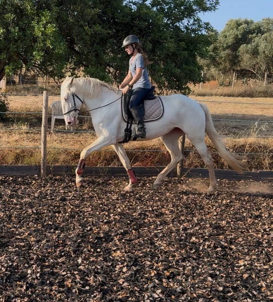 Gran y encantadora yegua Lusitano con potencial para cría y deporte Características: - Raza: Lusitano - Sexo: Yegua - Año de nacimiento: 2020 - Color: Cremello - Altura: 168 cm Esta impresionante yegua combina elegancia, tamaño y un carácter honesto. Con 1,68 m de alzada, se encuentra entre las representantes más grandes de su raza: un verdadero caballo excepcional y también muy interesante desde el punto de vista de la cría. En su línea no hay caballos grises, sino exclusivamente animales de colores vibrantes: un verdadero atractivo para los criadores interesados en el color. Está bien montada en los tres aires básicos, siempre fina en las ayudas y motivada en el trabajo. Conoce los movimientos laterales, el trabajo con barras y pequeños saltos bajo el jinete, y también se muestra con mucha visión y alegría al saltar libremente sobre obstáculos más altos. También le son familiares las vueltas hacia atrás, el trabajo en mano y el seguimiento libre. Va descalza, vive en un establo abierto con otra yegua en régimen de 24/7. Es social, amistosa y está bien integrada, tanto en el trato diario como en la vida en grupo. Veterinario, cuidado de los cascos, fisioterapia: todo lo acepta con una admirable calma y disposición a cooperar. Un verdadero caballo de confianza con un carácter equilibrado. Gracias a su buena ascendencia, su tamaño y su capacidad de movimiento, es adecuada tanto para el deporte de doma como para jinetes de ocio y de equitación de trabajo ambiciosos. Con su carácter sociable y su disposición para aprender, está lista para una nueva tarea y para una persona que la apoye y la ame. Por supuesto, también sería una candidata interesante para la cría, ya sea por su tamaño, su montabilidad o su herencia de color. Un caballo que florecerá aún más con la persona adecuada. Puedo enviar más fotos y videos si hay interés.