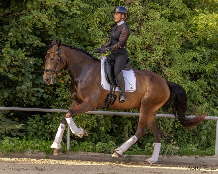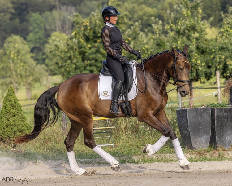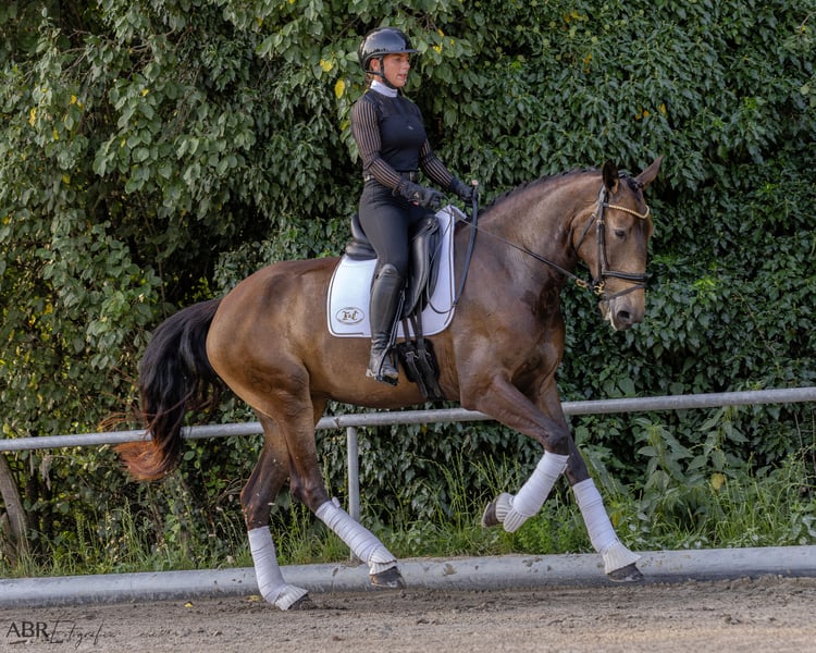 Szukamy wspaniałego domu dla naszej fantastycznej 4-letniej klaczy Lusitano Quilha, która trenuje ze mną (jeźdźcem FN) od prawie roku. Dzięki wysokości 1,70 m, umaszczeniu (Buckskin) i eleganckiemu wyglądowi zawsze przyciąga uwagę wszystkich. Zajęła 2. miejsce na tegorocznym pokazie hodowlanym i oczywiście ma również pełne papiery. Quilha jest licencjonowana, a zatem oferuje również duży potencjał dla hodowców. Jej poziom jest na solidnym poziomie A, opanowała już niektóre ruchy boczne i jest również zaznajomiona z pracą w ręku. Podczas jej treningu zawsze upewnialiśmy się, że jest on odpowiedni dla konia i wieku. W rezultacie Quilha jest nie tylko zawsze zmotywowana, ale także całkowicie nieskomplikowana i zawsze niezawodna w obsłudze. Nie ma złych doświadczeń z ludźmi. Łatwo ją załadować i wykuć, jest spokojna i opanowana w każdej sytuacji. Zna zarówno stajnię otwartą, jak i boksową, jest wytrzymała i bardzo zgodna z innymi końmi. W terenie jest dobrym przywódcą zarówno w pojedynkę, jak i w grupie. Jej nieustraszoność i pewność siebie w nieznanym otoczeniu sprawiają, że jest idealnym towarzyszem dla ambitnych jeźdźców startujących w zawodach lub jeżdżących rekreacyjnie, którzy również lubią podróżować w zmieniającym się otoczeniu. Kupiłem klacz z pierwszej ręki zimą 2023/24 roku. Od tego czasu klacz nigdy nie była chora ani kontuzjowana. Jestem do Państwa dyspozycji w celu uzyskania dalszych informacji, filmów lub umówienia się na spotkanie.