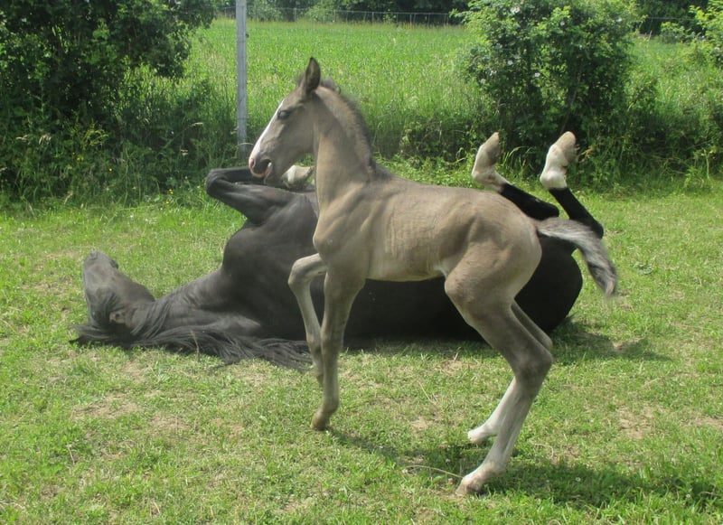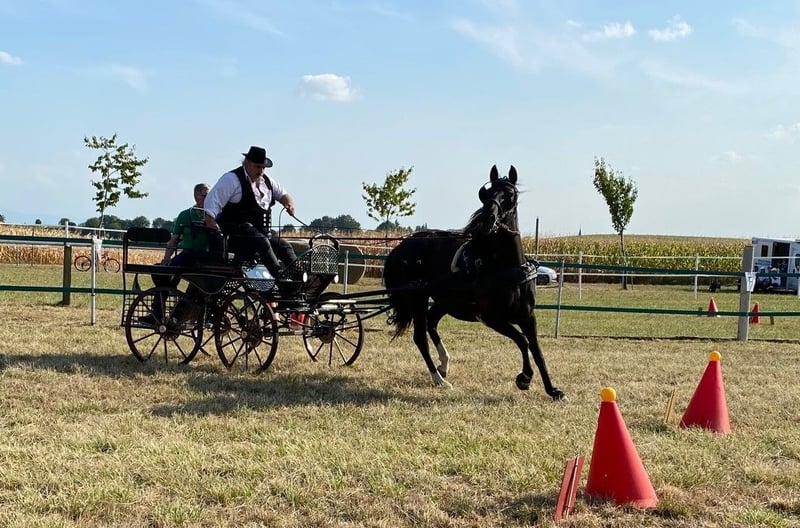 For sale: Beautiful 9-year-old Lusitano mare with full papers, licensed for breeding. Nera du Bratt stands at 156 cm and is a daughter of Galopin de la Font, an Olympic horse from Sylvain Massa's breeding (Olympic Games Beijing, World Championships Lexington, European Dressage Championships in Windsor, etc.) and our mare Salsa du Bratt, winner of the German International Breeding Show among 2-year-old mares. Like her mother, Nera is also a winner of the German International Lusitano Breeding Show in the 1-year-old mare category. She is very typey (Veiga), well-built, and has beautiful movement. The mare has been ridden for leisure but was mostly driven (solo). She handles well alone, in all three gaits, even in traffic, and has participated in small competitions. She is a wonderful family horse and very versatile. Nera has foaled an exceptional, large stallion foal in a lovely bay color. She is a good mother and of interest for breeding. She has an excellent character, loves human company, and loads easily into the trailer. She is regularly vaccinated and dewormed. Currently, she is ridden barefoot but is familiar with shoes and hippo sandals. She lives outdoors year-round on pasture; in winter, she is kept with other horses in an open stable with paddock. We are looking for a new, good home for our mare, preferably with horse companionship and turnout. The horse is located in Alsace near Karlsruhe (30 km). Nera can possibly be sold with harness and cart, and there is also a second bay Lusitano mare (6 years old) that has been driven before, though both are currently driven only alone. The cart and harness (Arden) are suitable for single or tandem driving. We speak German, English, and French. NB: The last two pictures show Nera’s foal.