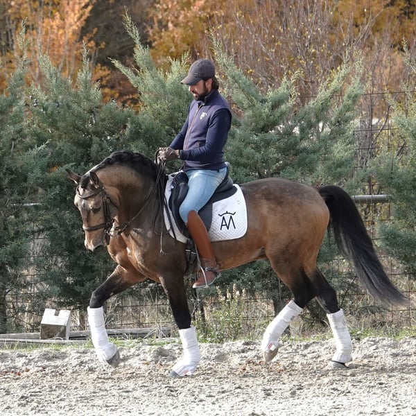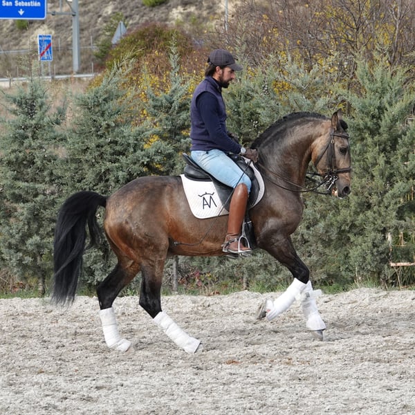 Lusitano born in 2016, ideal for riders who understand dressage as an experience of harmony, sensitivity and true connection with the horse. From the first steps, he offers balance, calmness and a natural feeling of ease that invites the rider to sit, breathe and allow the movement to flow. His natural scope and supple use of the back make the work comfortable and enjoyable, especially for a rider who values quality of movement and feeling under the saddle. It is easy to imagine yourself riding him: a soft contact, honest responses to the aids and a quiet confidence that allows you to focus on rhythm, balance and the simple pleasure of riding without tension or haste. He has been trained progressively and respectfully, with great care for both his physical and mental development, never rushing the process. A horse who continues to develop while maintaining a cooperative attitude and a very positive work ethic. Particularly suitable for a discerning amateur rider looking for a partner to enjoy daily training, progress with confidence and experience dressage from a place of harmony and wellbeing. Complete videos of the horse working under saddle and in liberty are available and highly recommended to fully appreciate his movement, balance and character. Watching the video is the best way to understand the feeling this horse transmits. Further information, additional videos and trial rides available upon request.