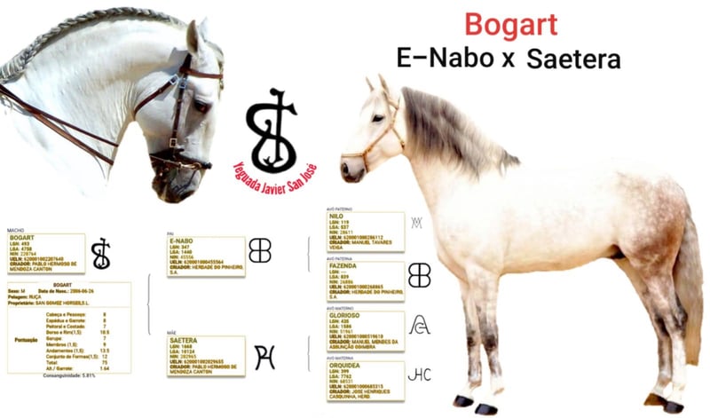 Denna vackra hingst representerar inte bara bästa egenskaper eftersom han är uppfödd av den berömda spanska tjurfäktaren Pablo Hermoso de Mendoza och har en utmärkt stamtavla med blodlinjer från Veiga stud, en av de äldsta och renaste portugisiska dubbarna. Han har extraordinära söner, barnbarn, döttrar och barnbarn. Och på toppen tränas han upp till Grand Prix-nivå med super piaffe, passage, stort trav, piruetter och flygande förändringar. En mycket stark häst, lätt att samla och spektakulära grindar. Bogart ligger på en av de bästa dubbarna för portugisiska hästar i Spanien. Eftersom de redan odlar med nästa generation är denna häst en idealisk utsikt för avel på en ny stud, förbättra blodslinjerna eller starta en stud för Lusitano-hästar. Och på toppen kan han omedelbart startas i dressyrsport på hög nivå. Mycket sällsynt möjlighet!
