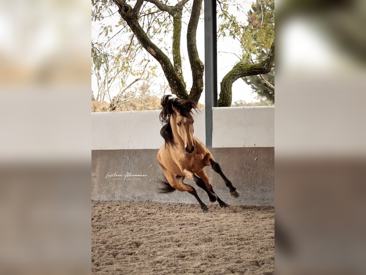 This young Lusitano stallion has only been ridden for a few weeks and is already performing exceptionally well. He is very cooperative under the saddle, knows the basics, and is now beginning to go on his first trail rides. On the ground, he is extremely friendly, easy to handle, and always eager to do his best. Santo Isidro impresses not only with his temperament but also with his beautiful coat: a typical buckskin measuring 15.5 hands with an expected final height of around 15.8 hands. He is compact, athletic, and ideally suited for Working Equitation. His very good canter stands out, demonstrating balance, uphill tendency, and potential for further training. He was raised on a 600-hectare property in a young stallion herd with peers at the stunning Jupiter Classical Dressage estate, which also belongs to the handsome gelding. He can be visited at any time. If you are looking for a young, honest Lusitano stallion with a fine character and great prospects, Santo Isidro is definitely worth getting to know.