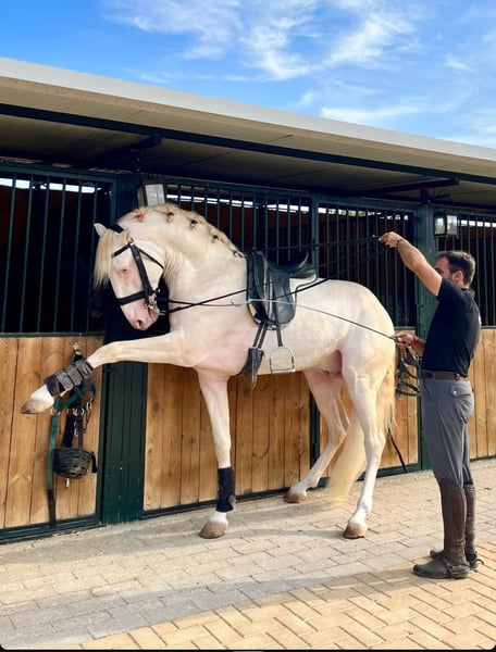 Elegant Lusitano Stallion for Sale – Perfect for Dressage! We are offering an impressive Lusitano stallion, born in 2022. This exceptional Cremello captivates with its refined appearance and balanced temperament. Standing at 16.1 hh, he is ideally suited for ambitious dressage riders who value quality and character. The young stallion demonstrates promising basic gaits and a natural willingness to develop further. His eagerness to learn and friendly nature make him an ideal partner for high-level dressage. For inquiries or additional information, please feel free to contact me. Schedule a viewing and see for yourself what makes this horse so special! Location: Spain – transportation can be arranged worldwide