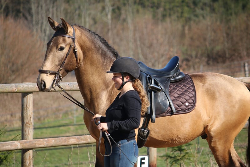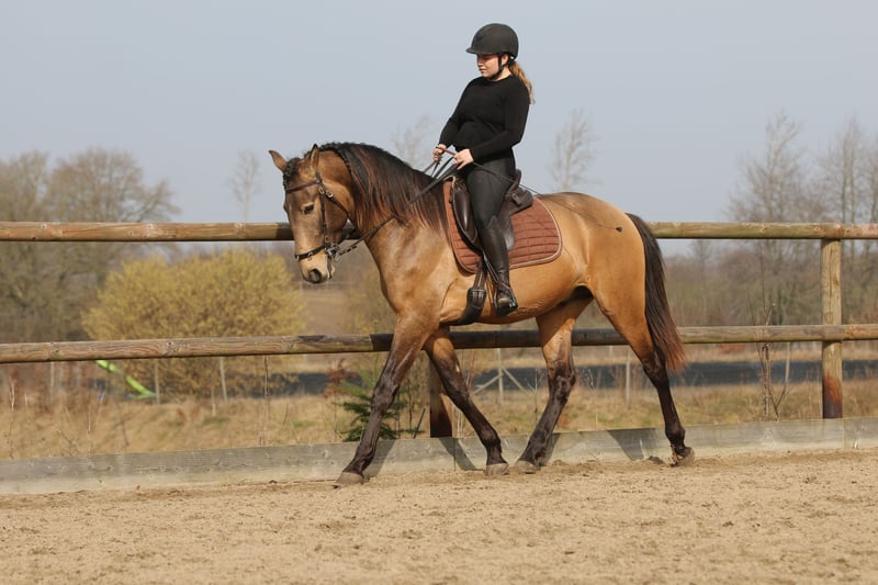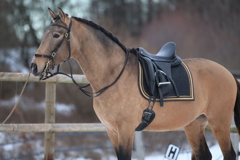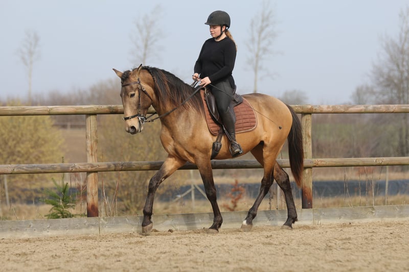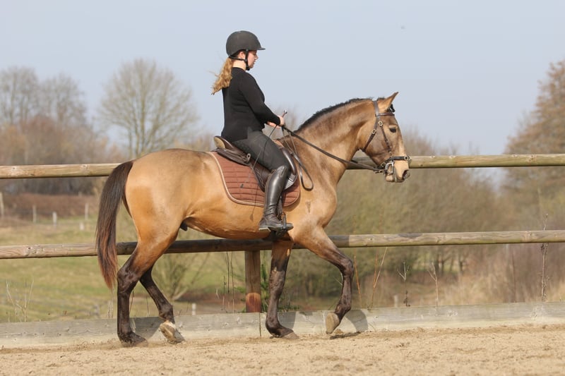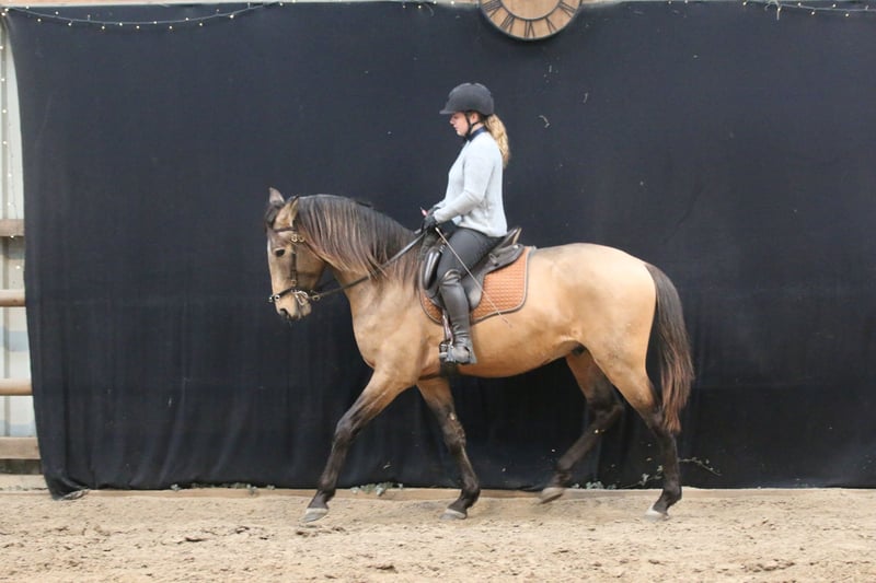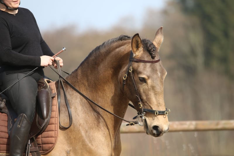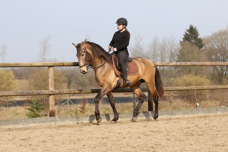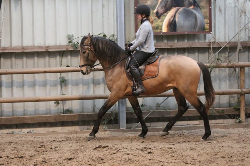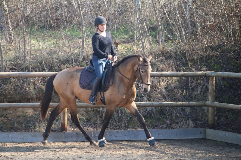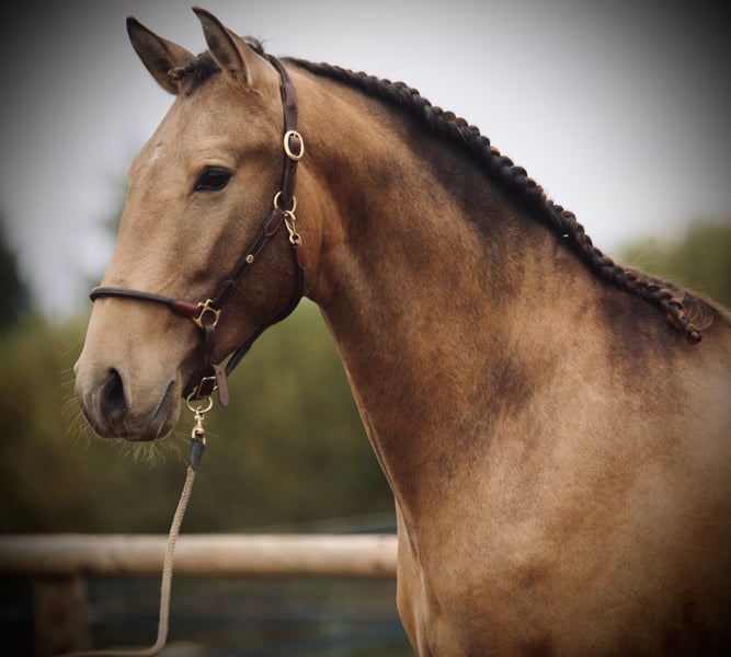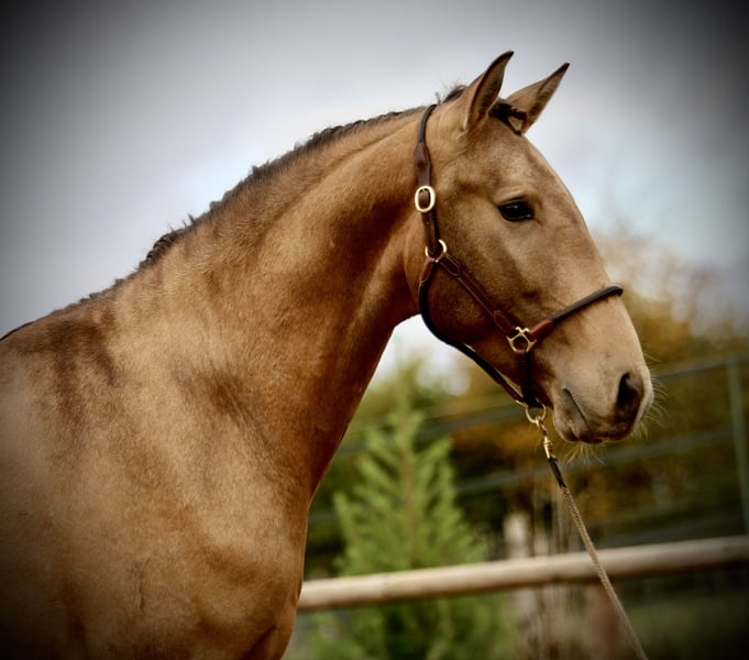 Salgado ist ein derzeit 162cm großer PSL Hengst in der Farbe Buckskin. Er hat unglaublich viel Ausdruck und zieht die Blicke auf sich. Mit grossrahmigen Bewegungen und schon jetzt einer schönen bergauf Galoppade macht er im Viereck eine gute Figur und wird dort sicher glänzen. Auch die ersten Male auf dem Working Equitation Platz hat er sich talentiert gezeigt. Er ist ein ruhiges und dem Menschen sehr zugewandtes Pferd, wie die Lusitanos eben so sind! Er ist jetzt seit ca 5 Monaten unterm Sattel. Wir haben ihn schonend mit Pad und Gebisslos angeritten. Jetzt geht es an die Arbeit. Er hat viel Spaß an der Arbeit und ist fleißig! Er steht bei uns derzeit 24/7 draußen und steht mit Wallachen und einem Ponyhengst zusammen. Er lässt sich verladen und läuft barhuf. Bei weiteren Fragen meldet euch gerne bei mir. Videos folgen in Kürze!