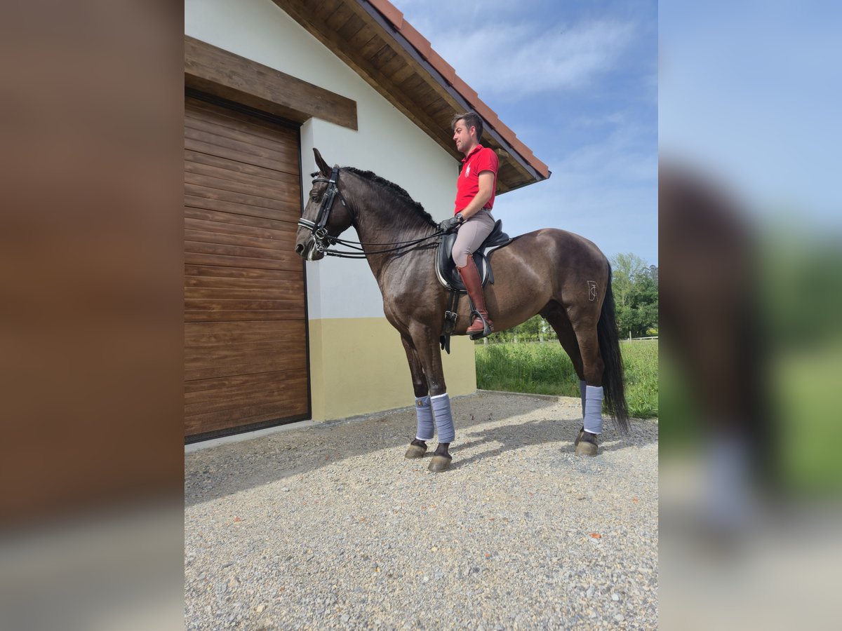 Pferd von ausgezeichneter Qualität und hervorragendem Dressur-Niveau Ein 7-jähriges Tier mit einer Größe von 1,68 m an der Widerristhöhe, das sowohl durch seine Schönheit als auch durch seine Funktionalität besticht. Es handelt sich um ein sehr vielseitiges Pferd mit solider Basis in der klassischen Dressur und einer außergewöhnlichen Arbeitseinstellung. Es führt korrekt Übungen wie Schulter-in, Hanken-in, Seitengänge und Unterstützungen in allen drei Gängen aus. Es vollführt Wechsel und Pirouetten mühelos und zeigt ein gutes Niveau in fortgeschrittenen Bewegungen wie Passage und Piaffe. Zudem beherrscht es hohe Schulübungen wie den spanischen Schritt und die Reverenz. Das Pferd ist sehr sicher und ausgeglichen, an alle Arten von Veranstaltungen und Umgebungen gewöhnt und lässt sich von nichts erschrecken. Es ist ideal sowohl für den Wettkampf, als auch für Vorführungen oder den persönlichen Genuss. Hervorzuheben sind seine Noblesse, leichte Handhabung und Arbeitsbereitschaft. Eine hervorragende Gelegenheit für alle, die ein zuverlässiges, vielseitiges Pferd mit Entwicklungspotenzial suchen.