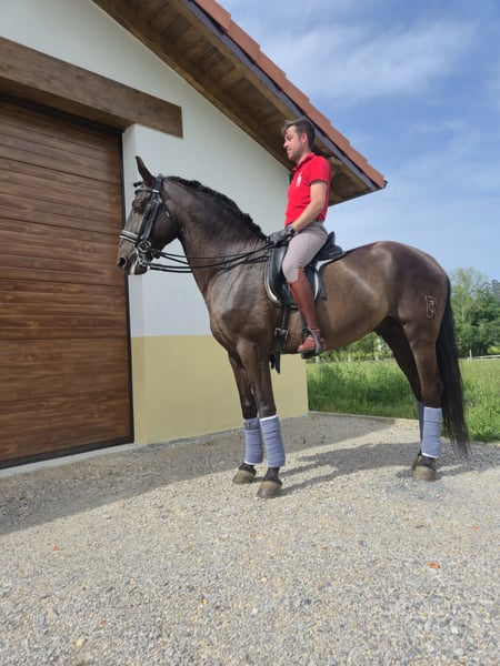 High-quality dressage horse with an excellent level of training. This 7-year-old gelding, standing at 16.1 hh, stands out for both his beauty and functionality. He is a very well-rounded horse with a solid classical dressage foundation and an exceptional attitude towards work. He performs correctly exercises such as shoulder-in, haunches-in, leg-yield, and three-tempi movements. He executes flying changes and pirouettes with ease and demonstrates a good level in advanced movements like passage and piaffe. Additionally, he includes haute école exercises such as Spanish walk and rein back. He is a very confident and balanced horse, accustomed to all kinds of events and environments, unshakable in any situation. Ideal for competition, exhibitions, or personal enjoyment. He is known for his noble temperament, ease of handling, and willingness to work. An excellent opportunity for anyone seeking a complete, reliable horse with potential.