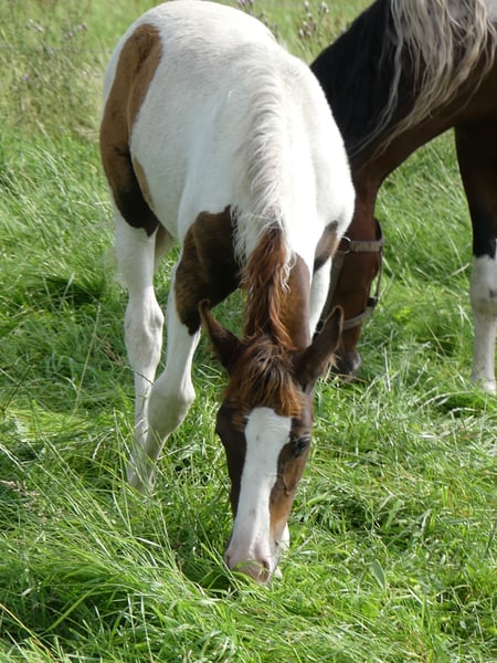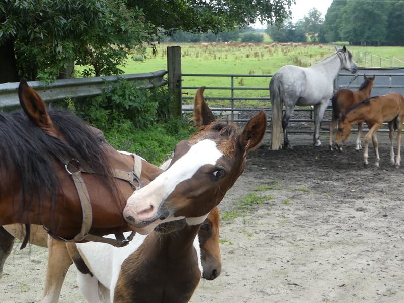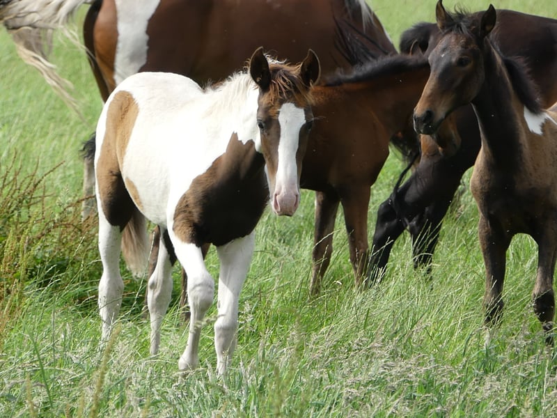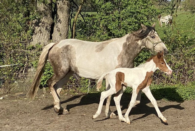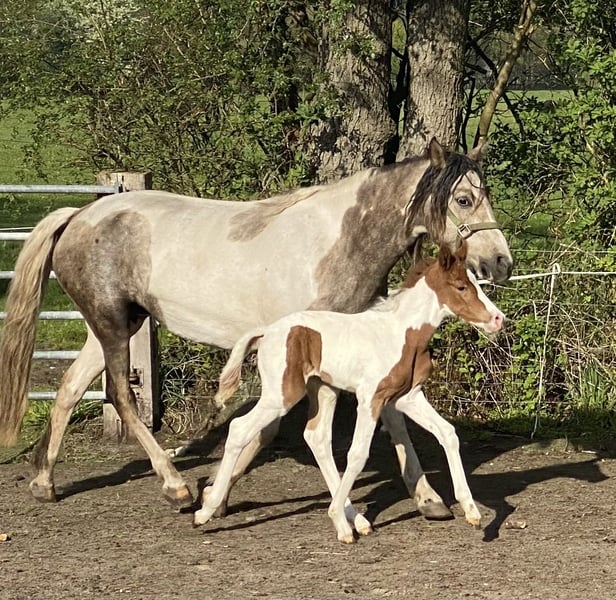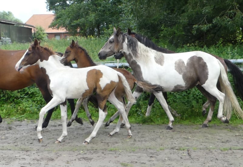 Gianna vom Hartungshof, geb.am: 24.04 2023 to małe piękno: bardzo ładne plamienie w połączeniu z prawidłowymi stopami i nogami oraz super dobrym chodem. Do tego dochodzi ciekawy urok, któremu trudno się oprzeć. Jak wszystkie nasze źrebięta, nauczyła się już źrebięcego ABC (dawanie nóg i prowadzenie wokół mamy). I już bawi się na pastwisku z innymi źrebiętami w prawie tym samym wieku. Jej chód to Marcha Picada i Marcha Batida, a także wykazuje ekspansywny chód i dobrze skaczący galop.