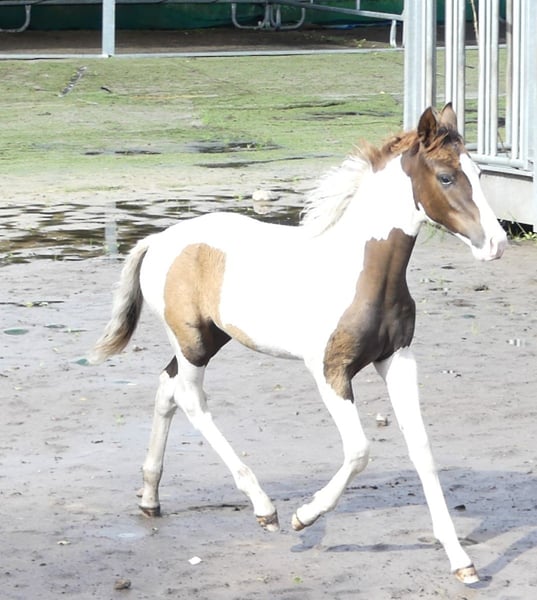 Gianna vom Hartungshof, geb.am: 24.04 2023 ist eine Schönheit: sehr schöne Scheckung gepaart mit korrektem Fundament, guten Exterieur und super guter Gangveranlagung. Dazu ein neugieriger Charme, dem man sich kaum entziehen kann, und ein kiebenswürdiger Charakter. Ihre Gangveranlagung ist Marcha Picada und Marcha Batida, dazu zeigt sie einen raumgreifenden Schritt und einen gut gesprungenen Galopp. Alles in allem wird sie ein bildhübsches, lernwilliges, im Umgang sehr feines und Bewegungsstarkes Pferd.