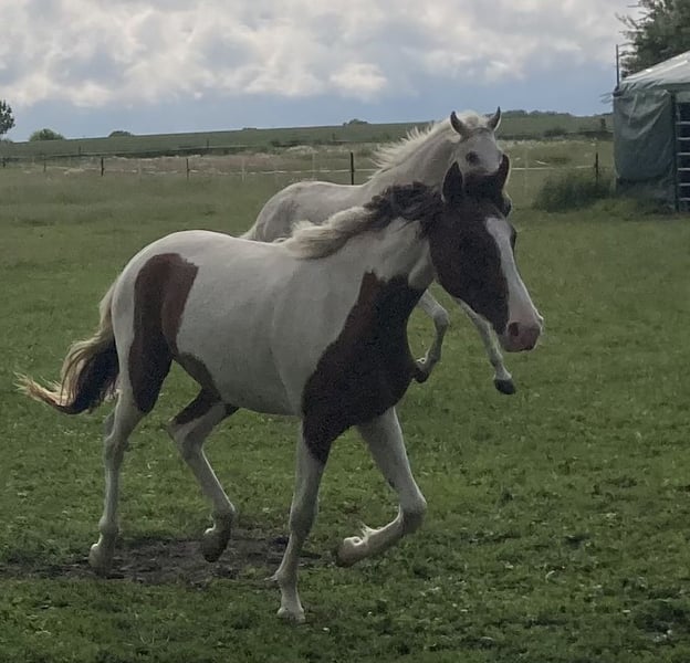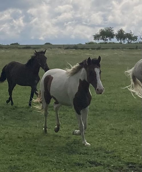 Gianna vom Hartungshof, née le : 24.04 2023 est une petite beauté : une très belle robe pie associée à un fondement correct et une super bonne prédisposition aux allures. De plus, elle a un charme curieux auquel il est difficile de résister. Comme tous nos poulains, elle a déjà appris l'ABC du poulain (donner les pieds et se laisser guider tout autour de sa maman). Et joue déjà avec d'autres poulains presque du même âge dans le pré. Ses allures sont celles de Marcha Picada et Marcha Batida, et elle montre un pas ample et un galop bien sauté.