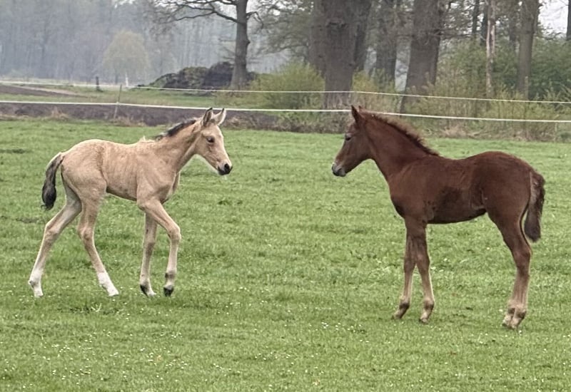 Gwenda von Hartungshof geb.am: 16.04.2025 ist eine wunderhübsche, gangstarke (Marcha Batida und Marcha Picada) Mangalarga Marchador Jungstute. Sie ist sehr Menschen bezogen und zeigte sich kooperativ beim lernen des Fohlen ABCs (halftern lassen, um Mama rundum geführt werden, Hufe geben). Inzwischen abgesetzt lebt sie in einer fast 20-köpfigen, gemischten Gruppe zusammen mit anderen Fohlen, Jährlingen, 2-jährigen und erwachsenen Pferden im Offenstall, auf dem Paddock und auf einer großen Weide. Gwenda wurde bereits 2 x gegen Tetanus und Influenza und 1 x gegen Herpes geimpft, außerdem wurde sie regelmäßig entwurmt und auch Hufbearbeitung ist kein Fremdwort für sie. Dass es nicht besonders viele Bilder und nur ein Video von ihr gibt, liegt an meinem eigenen gesundheitlichen Zustand in 2025.