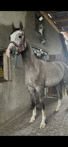 Ze względu na kwestie zdrowotne szukam dla mojego 4-letniego wałacha „Call me Casper” (około 178 cm, pochodzenie Clarcon × Polypur) nowego, odpowiedniego domu. Casper został już delikatnie wytrenowany do jazdy, a podczas treningów robiłem mu regularne przerwy, aby mógł spokojnie przetrawić zdobytą wiedzę. Opanował pewnie wszystkie trzy podstawowe chody, jest łatwy w prowadzeniu, zmotywowany i chętny do pracy. Zawody w skokach są już w jego repertuarze, choć nadal się rozwijają. Zna zarówno jazdę w hali, jak i na placu treningowym, i niezawodnie chodzi sam lub w grupie na teren, gdzie zawsze zachowuje się grzecznie i bezproblemowo. Również w ruchu ulicznym Casper jest odważny. W kontaktach jest bardzo przyjemny: podczas czyszczenia, załadunku i jazdy w przyczepie zachowuje się spokojnie i bezproblemowo. Posiadam ważny certyfikat TÜV z lutego 2025 roku wraz z rentgenami (bez zmian chorobowych), który można, na koszt właściciela, odnowić. Ze względu na jego młody wiek, Casper nie jest odpowiedni dla początkujących jeźdźców. Życzę mu domu, w którym będzie odpowiednio rozwijany, ale nie będzie nadmiernie obciążany. Zna zarówno stajnię zamkniętą, jak i pastwisko otwarte, jest kompatybilny zarówno z klaczami, jak i wałachami. Na początku 2026 roku Casper z nieznanych przyczyn przeszedł operację z powodu kolki. Operacja przebiegła bez komplikacji, dobrze się zregenerował i obecnie powoli wraca do jazdy.