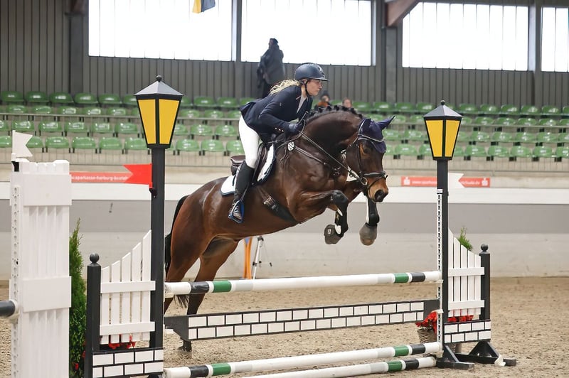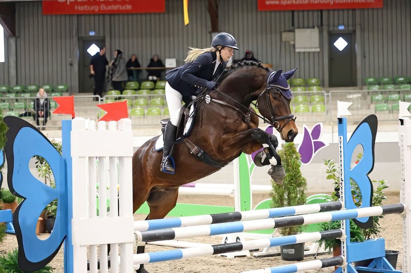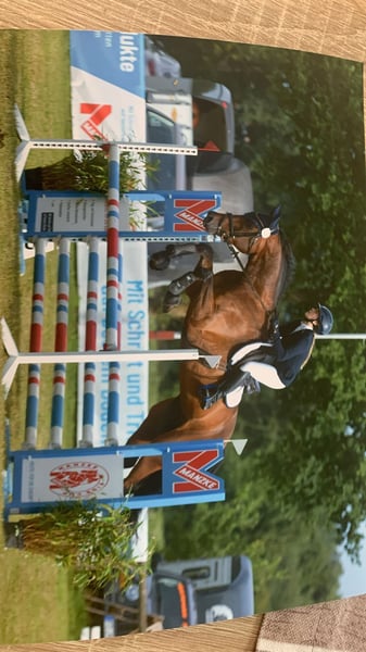 For sale is the 7-year-old gelding Courage. This handsome gelding impresses with his good basic gaits, rideability, and jumping ability. Courage has competition experience in both jumping and dressage, with a clear passion for jumping. He is very well-mannered, comfortable to ride alone or in a group, and is both farrier and loading friendly. His jumping quality is particularly noteworthy, and he has consistently received good marks in show jumping tests in the past. He is very cautious at the fences and aims to avoid mistakes. We are looking for a 5-star home where he can continue to develop and be supported. For inquiries or further information, please feel free to contact me at 0173-8022020.