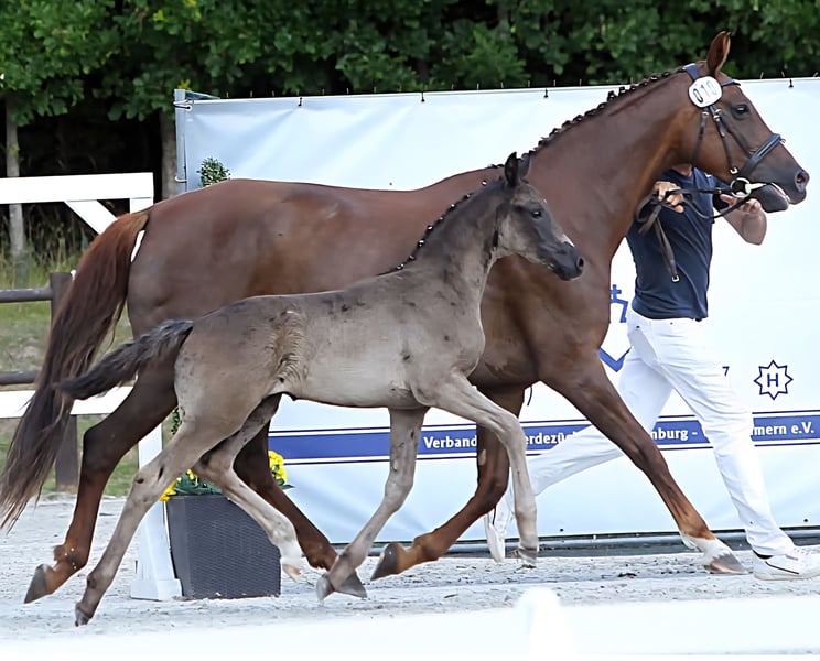 For sale is a dressage-bred filly. Pedigree: Sire: DSP Dream Royal Dam: State Premium Mare Fürst Romancier x D'Olympic x Rubinstern - Date of birth: May 23, 2025 - Will be black - Estimated final height: 1.70 m The pedigree unites the guarantors of dressage sport. "Overall, this is a horse where one can envision a great career both in breeding and especially in sport!" Our filly stands in a modern and athletic type, presenting with an extraordinary presence, excellent top line, a very good neck, and a noble head. Donnabell shows light, airy movements and an active hindquarters. At the championship, her correct foundation, presence (type), as well as her interior, exterior, and movement were rated highly by the judging panel. Her sire is stationed at Gestüt Sprehe. He is the champion stallion of the DSP licensing in Munich. The dam has achieved the state premium and has presented several outstanding winning foals in recent years, including one licensed stallion. Video can be sent upon request. Initial contact preferred via WhatsApp or by phone. 01724020355