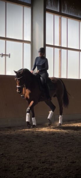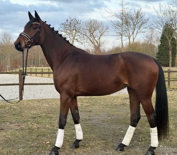 Zum Verkauf steht eine 5-jährige, ca. 1,70 m große Hannoveraner Zuchtstute, eingetragen im Stutbuch I. Abstammend von Desperados & Finest. Sie hatte im April 2025 ein gesundes Stutfohlen zur Welt gebracht. In dieser Zeit zeigte sie sich auch absolut unkompliziert im Umgang - das Trennen von ihr und dem Fohlen verlief immer problemlos. Die Stute geht auf den Anhänger/Transporter, kennt die Führanlage, ist regelmäßig beim Schmied, Zähne wurden gemacht, Herpes, Influenza, Tetanus geimpft .Turnierpferdeeintragung vorhanden. Geht spazieren, joggen, läuft am Fahrrad mit. Keine Krankheiten. Bei ernsthaftem Interesse gerne weitere Infos / Videos per Nachricht.