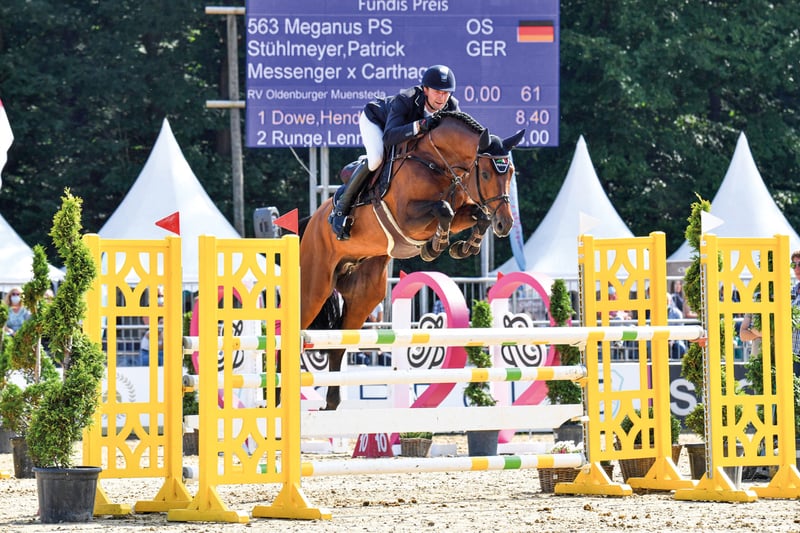 Nuestro Meganus PS va viento en popa: victoria en las dos pruebas clasificatorias del Bundeschampionat para caballos de cinco años con puntuaciones de 9,2 y 9,5, victoria en el prestigioso 14º Campeonato en el Dobrock con una puntuación de 9,0 y victoria en la prueba clasificatoria del Bundeschampionat en Diepholz con una puntuación de 9,0. Sólo en la temporada 2021, suma otras nueve victorias en pruebas para jóvenes saltadores bajo la dirección de su entrenador Patrick Stühlmeyer. Meganus PS impresiona por su ilimitado talento para el salto y una línea de sangre sensacional y poco común. Meganus PS se utilizará como semental por primera vez en 2022. Su padre Messenger es a su vez el único hijo con licencia de Montender/Marco Kutscher, medallista de bronce individual y por equipos en los Juegos Olímpicos de Atenas/GRE 2004, sexto en la Copa del Mundo de Milán/ITA en 2004 y doble Campeón de Europa en San Patrignano/ITA en 2005. En su HLP ya recibió un 10 por su capacidad de salto. Con Florian Meyer zu Hartum, Messenger se convirtió en 2014 en subcampeón de Warendorf de caballos de salto de siete años, tras haberse clasificado previamente en las finales del Bundeschampionate. También registró sus primeros éxitos internacionales. En 2015 y 2016, ganó los Campeonatos CSI3* en Redefin con varios jinetes. Con Philip Rüping, obtuvo el segundo puesto en el Gran Premio de Wiesbaden en 2017 y se colocó primero en Calgary/CAN, Arezzo/ITA y Redefin de nuevo. Messenger tiene ahora su base en Estados Unidos. Sus hijos mayores ya triunfan en competiciones de salto de 1,50 metros, como Dessenger/Philipe Rozier/FRA, Marilyn/Daniel Bluman/ISR, Miss Aragona PS/William Whitaker/GBR y Mahony/Philipp Schulze Topphoff. La madre Whizz Kid es también la madre de los saltadores de 1,60 metros Chataga/Alejandro Mills/MEX, H5 Chaganus/Eduardo Pereira de Menezes/BRA y Casquo Blue/Douglas Lindelöw/SWE (4º puesto en los Campeonatos del Mundo por Equipos de 2021 en Riesenbeck). Campeonatos de Europa por equipos en Riesenbeck), así como los otros saltadores internacionales Chaccocartes (salto de 1,45 metros), Chacco's Whizz Kid (todos por Chacco-Blue; salto de 1,40 metros) y Messi's Whizz Kid PS (por Messenger; salto de 1,25 metros). La segunda generación de Carthago participó en los Juegos Olímpicos de Atlanta/Estados Unidos y Sydney/Estados Unidos con Jos Lansink/BEL. También ganó las Copas de Naciones de Aquisgrán, Rotterdam/NED y La Baule/FRA y también se le considera uno de los hijos más influyentes de Capitol I en términos de cría. La nieta Gastona produjo al licenciado Chacgrano (por Chacco-Blue; saltador de 1,60 metros)/Patrick Stühlmeyer así como a los saltadores de 1,60 metros Calasko Z (por Calvaro Z)/Manuel Sanderos/MEX y Colasko (por Colman)/Nicolas Pizarro/MEX. También han tenido éxito internacional: Balouboy (por Baloubet du Rouet; saltador de 1,40 metros), Polasko (por Polytraum; saltador de 1,50 metros), Casanova (por Carthago; saltador de 1,45 metros), Calvogran (por Calvaro Z; saltador de 1,45 metros) y Caltona (por Calvaro Z; saltadora de 1,45 metros). Grannus y Wohlgemuth ocupan el tercer y cuarto lugar en el pedigrí. La bisabuela Walaska produjo Gaston M (por Grannus)/Hansueli Sprunger/SUI y los caballos de doma clásica de nivel avanzado (S) Traston (por Traumdeuter) y Chateau Paradise (por Continue). También de la línea materna son los sementales Sir Nymphenburg I y II (por Sir Donnerhall I) y Felice (por Diamond Hit). Una línea de yeguas excepcional con numerosos saltadores de 1,60 metros. Con licencia para: Holstein Global, Mecklenburg, OS-International, Rhineland, asociaciones del sur de Alemania, Westfalia, Zangersheide Directamente al pedido de semen: https://schockemoehle.com/ger/deckstation/samenbestellung/samenbestellung-en.html?hengst=Meganus+PS