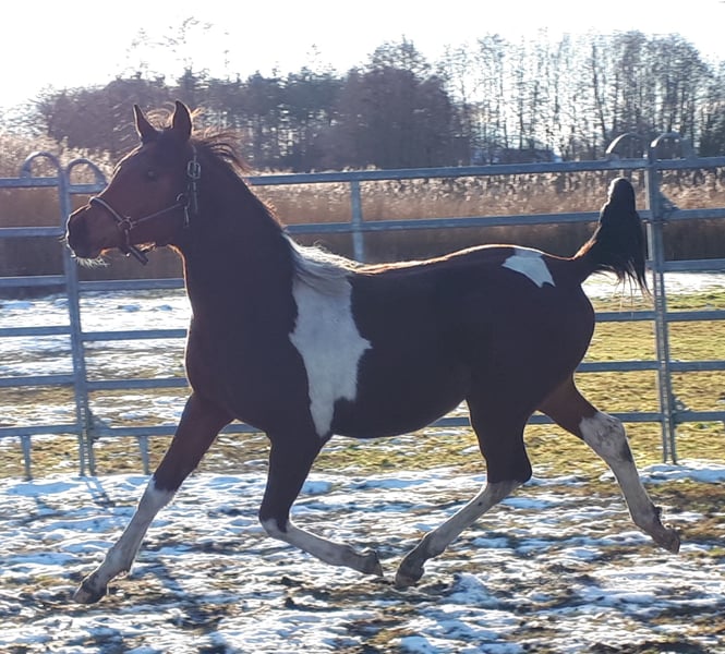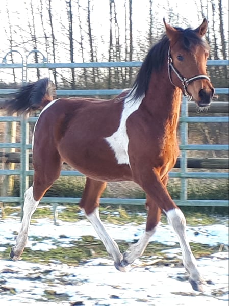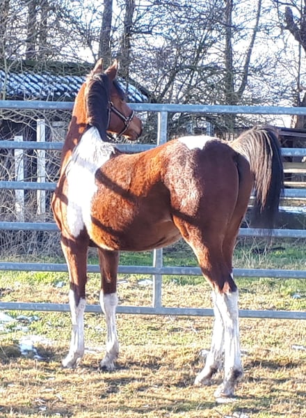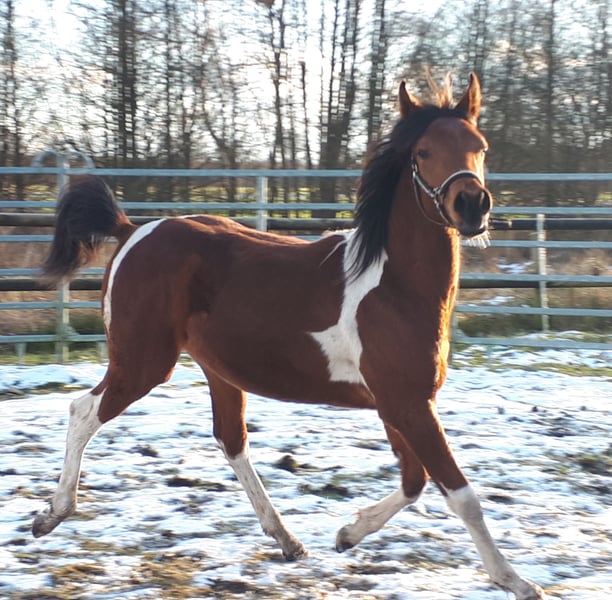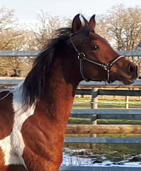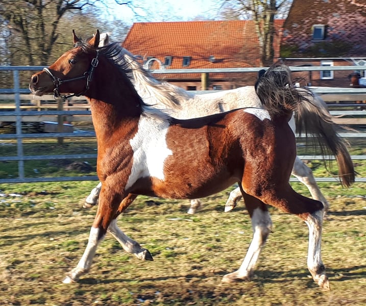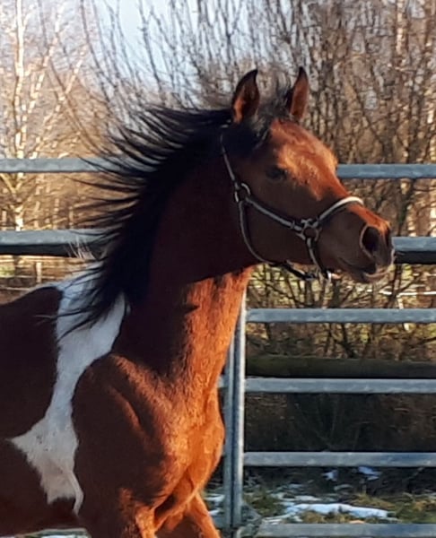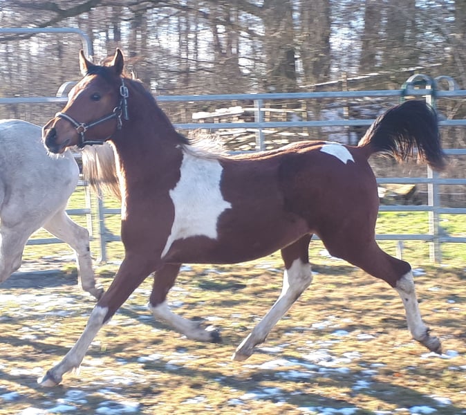 On April 4th, 2024, we welcomed a stunning Pintabian foal with 99.85% Arabian bloodlines. His appearance reflects his pedigree perfectly, and we are absolutely smitten. Sweatson Wiko Nibufa is halter-trained, knows how to be groomed, is accustomed to trailer loading, and is footed. He has been awarded a premium by the VZAP. His dam comes from a show line, while his sire is from a jumping and endurance lineage. He would also make a real eye-catcher as a leisure partner. His mother is a full Arabian mare, 14.8 hands, sired by IS Farah out of DG Maksus, very gentle and loyal in handling. Her pedigree includes Emigrant, Probat, Thee Desperado, and EL Perfecto. His sire is a Pintabian stallion with 99.7% Arabian blood, standing at 15.3 hands, licensed by the VZAP. He comes from the Khadra line of the HAB Dreamdancer foundation, with ancestors including GP Dakota Dancer, Padron, AR Emarald, and Balaton. Both parents are available for viewing on-site. Wiko has an equine passport with pedigree and vaccination record. He is regularly dewormed and has been seen by the farrier. A handsome boy with excellent character and outstanding potential.