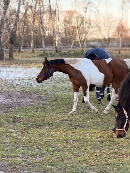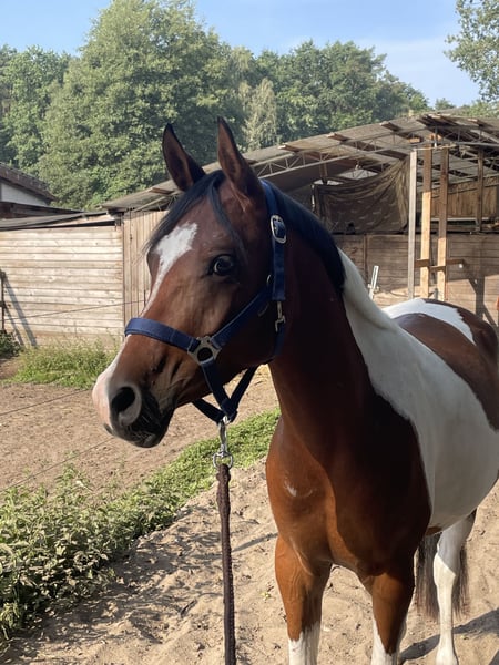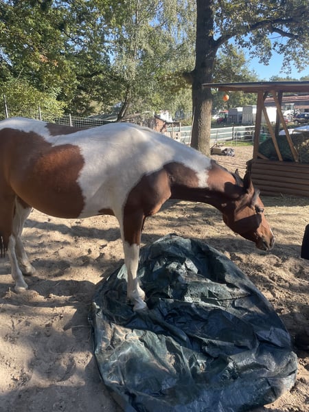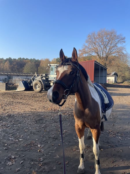 Wunderschöner bunter Wallach zu verkaufen . Painted Dayan ist ein buntes großes Pony mit einem Riesen Herz . Er wird dieses Jahr 5 Jahre alt , ist ca. 1,50 m groß und ist ein arabisches partbred. Er wird derzeit ans anreiten gewöhnt und kennt bisher Longe ( auch ausgebunden ) , spazieren gehen , schrecktraining, freispringen (wo er sich auch talentiert zeigt ) , Sattel , drüberliegen und vieles mehr . Er macht regelmäßig stangenarbeit und wird abwechslungsreich trainiert . Dabei ist er steht’s allem offen gegenüber auch wenn er anfangs skeptisch ist lässt er sich zu allem überzeugen . Er ist super lieb beim Schmied und auch das Anhänger fahren kennt er das aufladen haben wir schonmal geübt und benötigt nur etwas Zeit aber auch dabei wird er nie gefährlich oder stumpf . Er ist ein Pony was beschäftigt werden möchte aber ist Kindern super lieb gegenüber und lässt sich auch von ihnen ganz brav putzen . Er steht derzeit im Offenstall mit zwei weiteren kennt aber auch boxenhaltung . Ihn kann man mit jedem zusammenstellen egal ob Wallach Oder Stute . Ein Foto von der abstammung kann verschickt werden