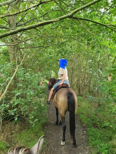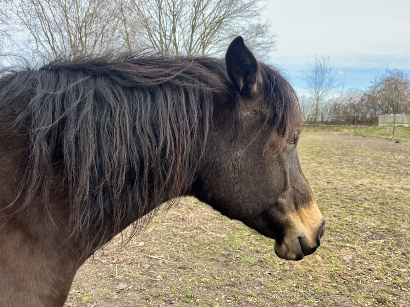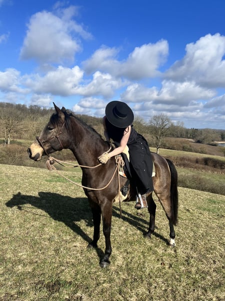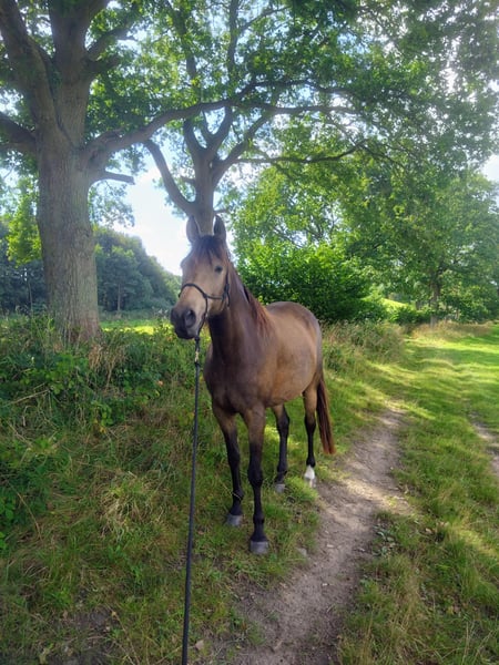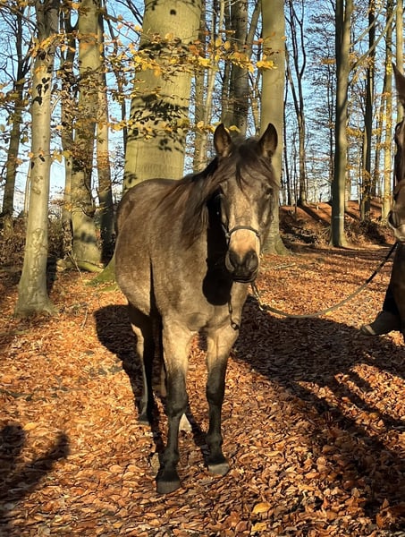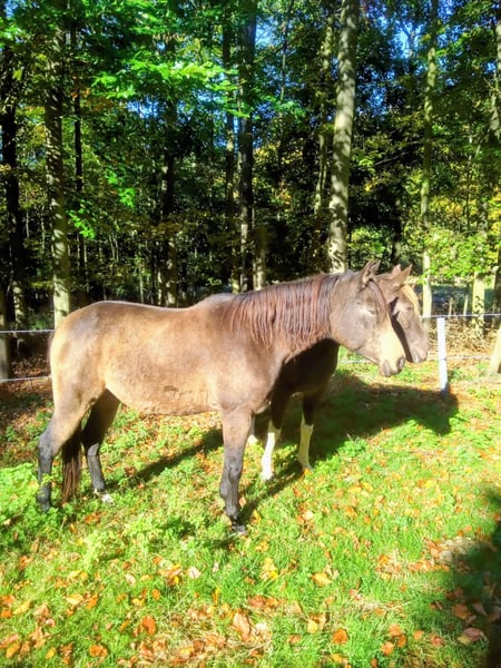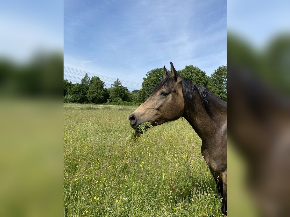 If everything fits, I am offering my 9-year-old part-bred Arabian mare in buckskin color for sale. She is a very refined horse, and I have only ridden her bitless so far. We have done a lot of groundwork and natural horsemanship. Otherwise, we mainly rode in the outdoors for leisure. I have also used her occasionally for therapeutic work. She can be very relaxed, but also as typical for Arabian horses, spirited and energetic. She also has the "turbo gait," meaning she is very fast and enjoys moving. She has always been kept in an open stall with me, and I would like this to continue for her. However, she needs a secure dry shelter, as she tends to be lower in the herd hierarchy and does not like standing in the rain. Alternatively, a paddock-box at night and pasture during the day would also be suitable for her. She is barefoot (I put hoof boots on her for rides in front) and has no problem with her hooves being handled. She has been regularly vaccinated, dewormed, and had her teeth checked annually. She also receives osteopathic treatment once or twice a year. Due to her generally high body tension, I occasionally give her small massages while grooming. Even if she can get quite lively, she is always very manageable on a long lead rope. Most recently, she was in a mare herd, but she is also familiar with mixed herds. She is not a heavy weight carrier; I would say she can comfortably carry up to 70 kg. I am only placing her in the best hands – this is not an emergency sale. She is also likely to pass on many different color genes. The last picture shows her sire, Paintabian "Shicco Ibn Shai." I have a specially fitted Deuber Jerez saddle in size S2 (Bückeburg model) for her, which can be purchased separately.