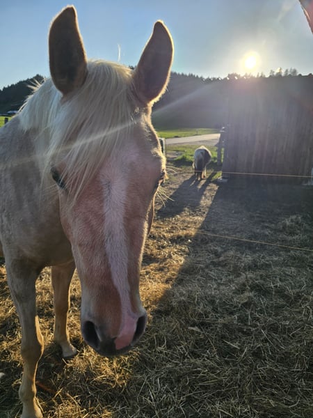 Wegen Aufgabe der Pferdehaltung ist diese bildschöne Jungstute abzugeben Palomino geb. 2023, Stm. z.Zt. 150 cm sehr lieb, sehr menschenbezogen, ruhig und ausgeglichen, nervenstark, ist noch roh, beherrscht natürlich das Fohlen-ABC, ist im Offenstall aufgewachsen hat leider ein Sommerekzem bei Fragen gerne melden