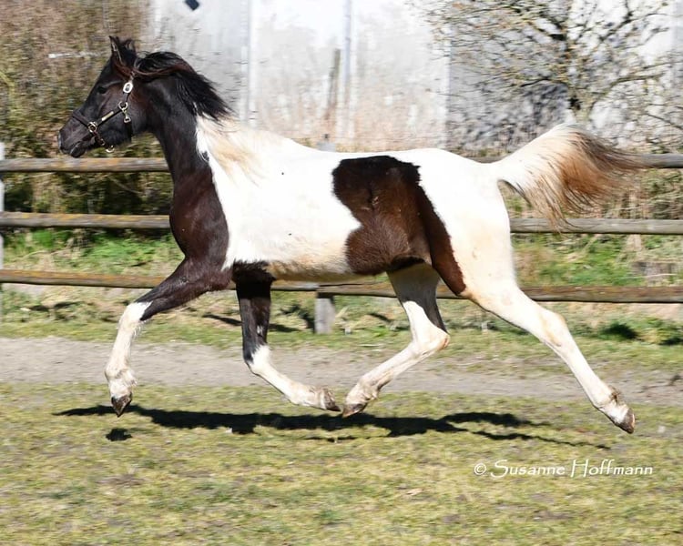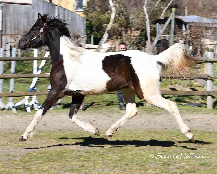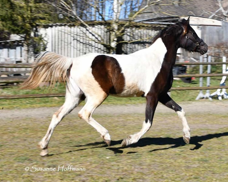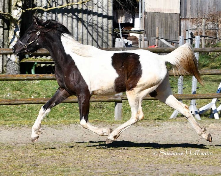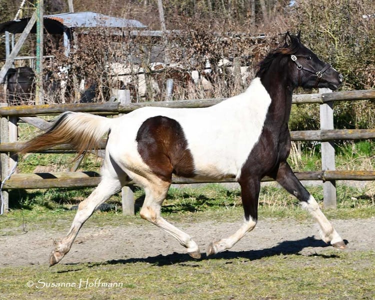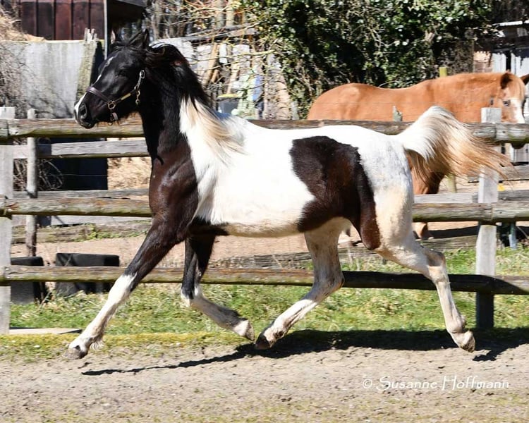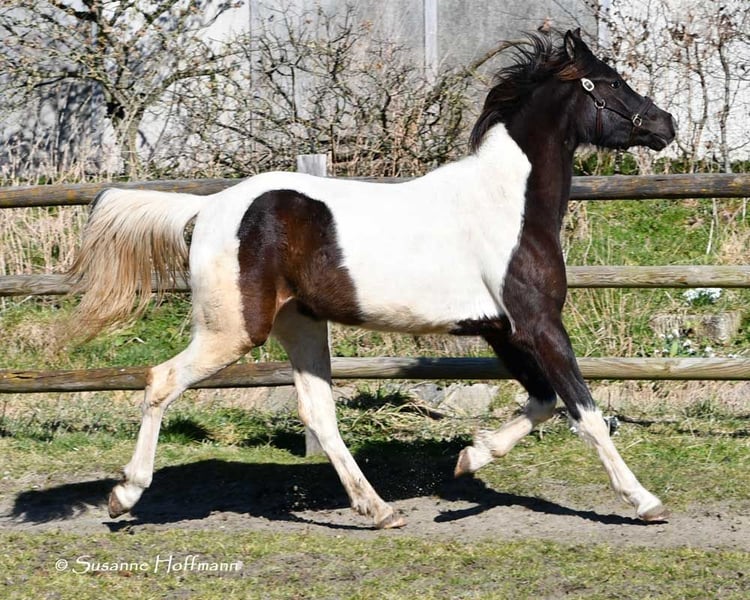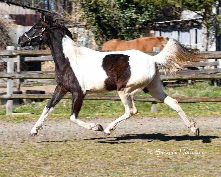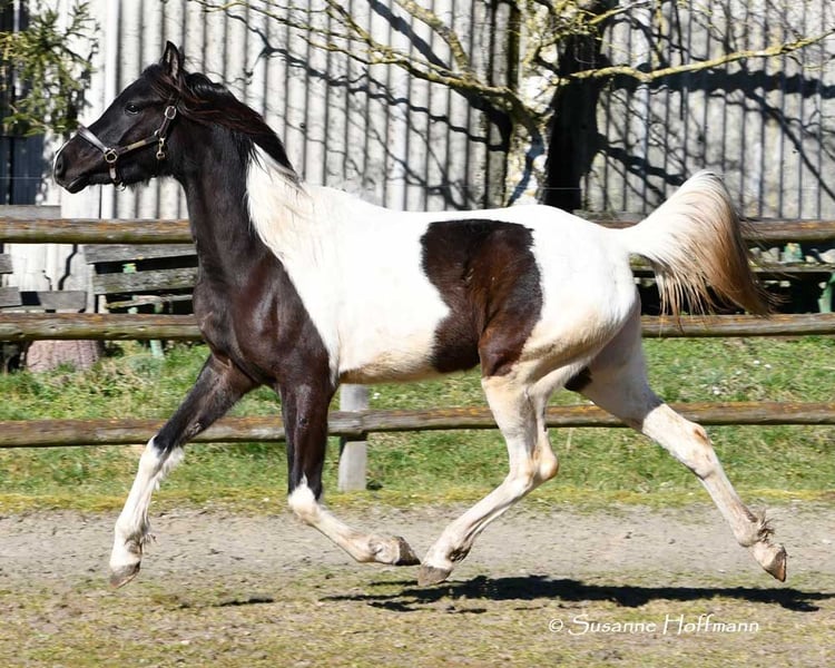 Sarabi ist eine sehr große Stute mit viel Typ und gutem Rahmen. Sie ist völlig unkompliziert mit anderen Pferden im Offenstall und sehr verträglich. Sie kennt den normalen Umgang z.b. führen, anbinden usw. und auch beim Schmied benimmt sie sich anständig. Ihr Vollbruder ist Körungssieger und Reservesieger der Hengstleistungsprüfung und ihr Vater ein aus USA importierter Pintabian . Ihr Araberanteil liegt bei > 98%AV, so das sie ideal ist für die Zucht von Pintabians , diese sollen nach internationalem Standard 99%AV nachweisen können. Dazu ist sie auch noch reinerbig für Rappe getestet, so das sie niemals Fuchsfohlen bekommen kann und mit Rappen zu 100% Rappen und Rappschecken.