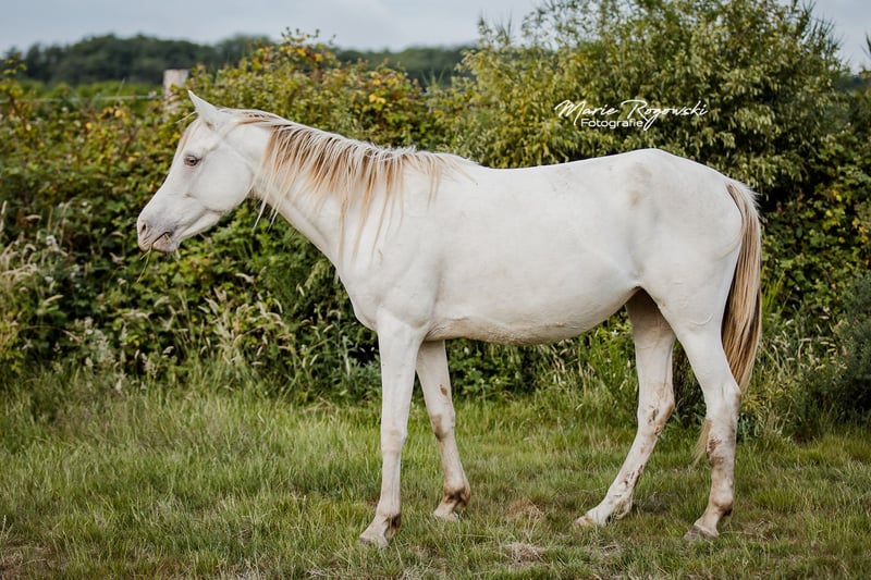 Deutsches Reitpferd | geb. 2020 | Cream Champagne KHREME DE COCO vereint auffällige Farbgenetik mit einem sportlich-eleganten Erscheinungsbild. Als Tochter des gekörten Vollblut-Hengstes TCF Palladium und der Amber Champagne-Stute Khreme Kharamel GF trägt die seltene Farbe Cream-Champagne (also sowohl Cream als auch Champagne Aufhellungsgen vorhanden), das sie zu einem Blickfang in jeder Herde macht. Khreme de Coco hatte eine Verletzung am Hinterbein, die sorgfältige Pflege und Beobachtung erfordert hat. Sie läuft derzeit klar, zeigt keine Schmerzreaktionen und bewegt sich unauffällig. Es ist jedoch davon auszugehen, dass ein bleibender äußerlicher Makel zurückbleiben wird, der ihre Nutzung in Zucht oder Freizeit nicht zwingend einschränkt, aber hier trotzdem erwähnt werden soll.
