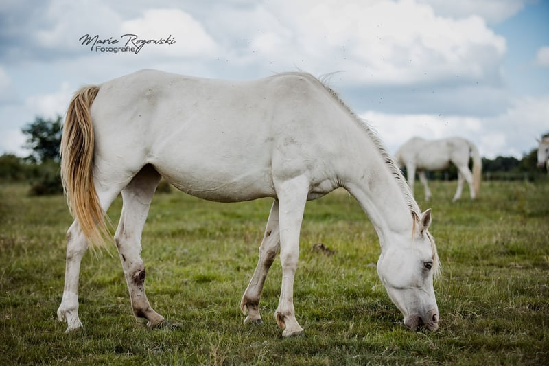 German riding horse | born 2020 | Cream Champagne KHREME DE COCO combines striking colour genetics with a sporty, elegant appearance. As the daughter of the licensed thoroughbred stallion TCF Palladium and the Amber Champagne mare Khreme Kharamel GF, she has the rare cream champagne colour (i.e. both cream and champagne lightening genes are present), which makes her an eye-catcher in any herd. Khreme de Coco had an injury to her hind leg that required careful care and observation. She is currently walking clearly, shows no signs of pain and moves normally. However, it is likely that a permanent external blemish will remain, which does not necessarily limit her use in breeding or leisure, but should nevertheless be mentioned here.
