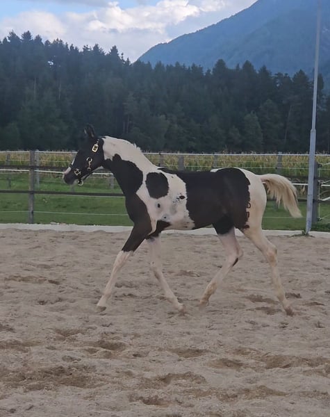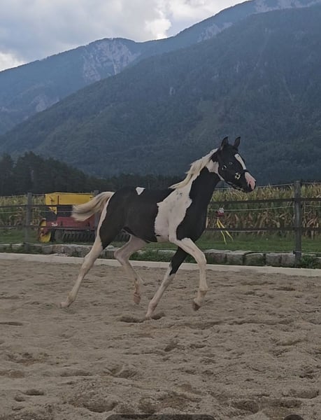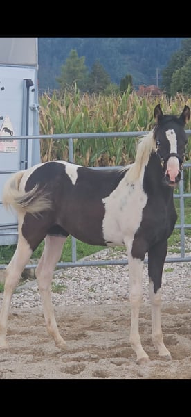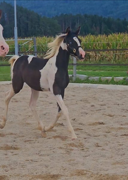 Phenomenal Maisinah is an exceptionally typified, noble, and incredibly people-oriented young mare who captivates immediately with her top-class pedigree and charm. She combines the best breeding potential with prospects as a riding horse, making her a true gem for connoisseurs and enthusiasts. Data & Special Features: Born: April 19, 2025 Final height: approximately 155 cm VA percentage: impressive 98.34% Genetics: homozygous Tobiano – guarantees exclusively spotted offspring Unique: a fascinating ice-blue eye, which is also heritable Pedigree – Quality at the highest level: Sire: Touchof Dandi – premium stallion, licensing winner, and HLP reserve champion Dam: direct daughter of the American elite stallion TE Pharenheit, known for his dream character – she is the most confident and calm mare in the herd Half-brother (through the mother Phantastika): successful, licensed breeding stallion and HLP winner Maisinah's Advantages at a Glance: Rare bloodline: 98.34% VA percentage – a precious treasure for Pintabian breeding Homozygous Tobiano – every foal guaranteed to be colorfully marked Ice-blue eye – a fascinating and rare feature Character: calm, people-friendly, curious, and absolutely uncomplicated Robustly raised in a paddock, well socialized Unique Opportunity: Currently, there is no other homozygous black and white mare with a blue eye in all of Austria. Maisinah is thus a true rarity – an absolute highlight for both ambitious breeders and enthusiasts looking for something truly special. She will be ready to move to her new home by mid to late October. A personal visit and getting to know her are of course warmly welcomed.