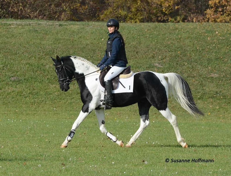 Nuestro Lopez sabe exactamente lo hermoso que es y lo demuestra, pero también es muy sociable y tranquilo. Es un hermoso caballo de color tobiano, lo que significa que lleva además del gen Tobiano un Frame Overo, pudiendo transmitir estos dos genes de forma conjunta o individual. Lamentablemente, en nuestro establo está relacionado con casi todas las yeguas, y esa es la razón por la cual no podemos quedárnoslo nosotros mismos. Fue premiado con una puntuación de 8,75, lo que indica un rendimiento excelente, destacando especialmente en tipo y movimiento. Actualmente, todavía parece un poco más oscuro, pero ya se puede ver claramente que es un verdadero caballo tobiano negro. Tanto su padre como el padre de la madre fueron importados de EE. UU., por lo que probablemente sea de sangre pura en la mayoría de los otros criadores. Su padre, Secret Legacy, fue distinguido como semental de alto rendimiento debido a su excelente prueba de rendimiento y, hasta ahora, su descendencia se muestra muy dócil, equilibrada y apta para la monta.