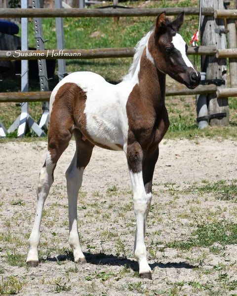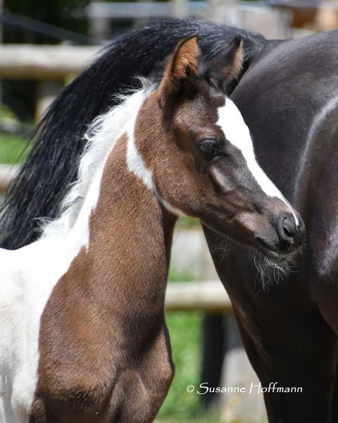 Our Lopez knows exactly that he is beautiful and shows it, but he is also very people-oriented and calm. He is a beautifully marked black tovero, which means he carries both the tobiano gene and a frame overo gene, and can pass on these two genes together or separately. Unfortunately, he is related to almost all of our mares, which is also the reason why we cannot keep him ourselves. He was awarded a super high score of 8.75 and particularly impressed in type and movement. Currently, he appears somewhat brownish, but it can already be seen that he is a true black pinto. Both his father and his mother's father were imported from the USA, which means he is likely to be genetically unrelated to most other breeders. His father, Secret Legacy, was awarded as a performance stallion due to his excellent stallion performance test, and so far, his offspring have shown to be particularly easy-going, very balanced, and rideable.